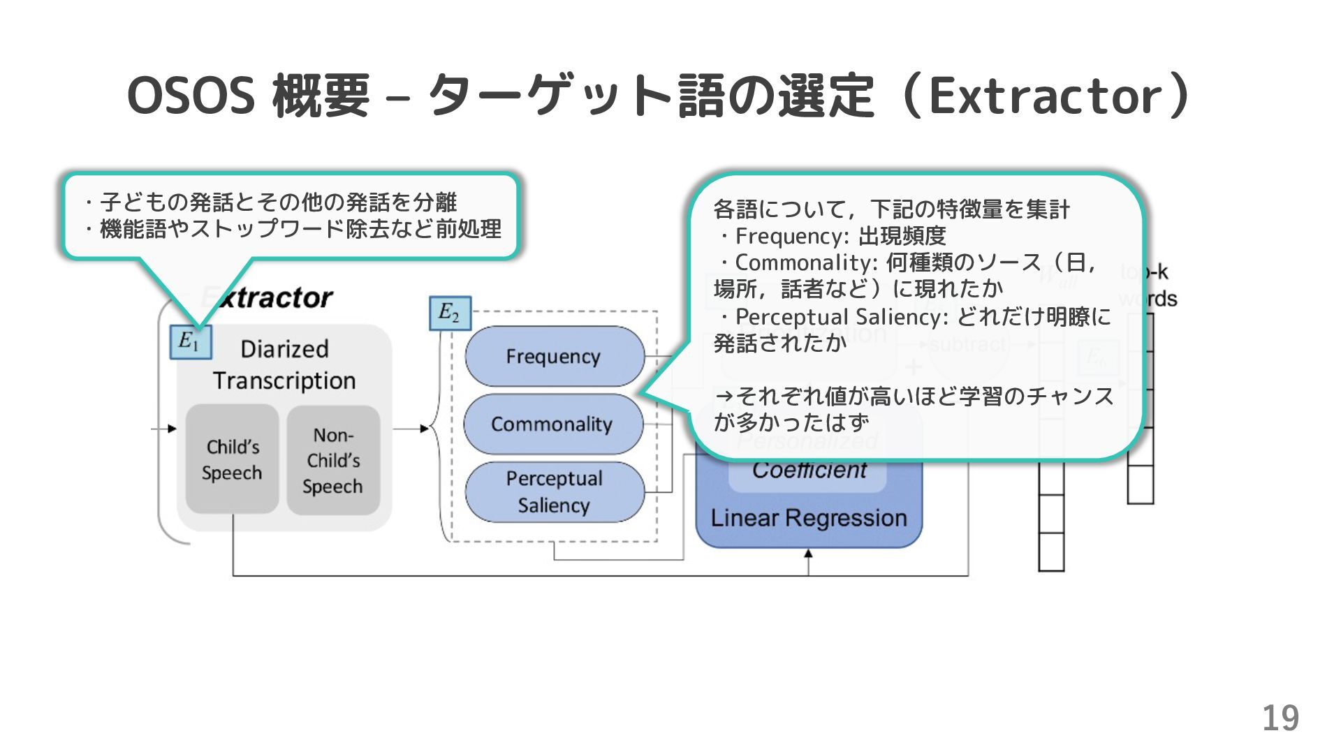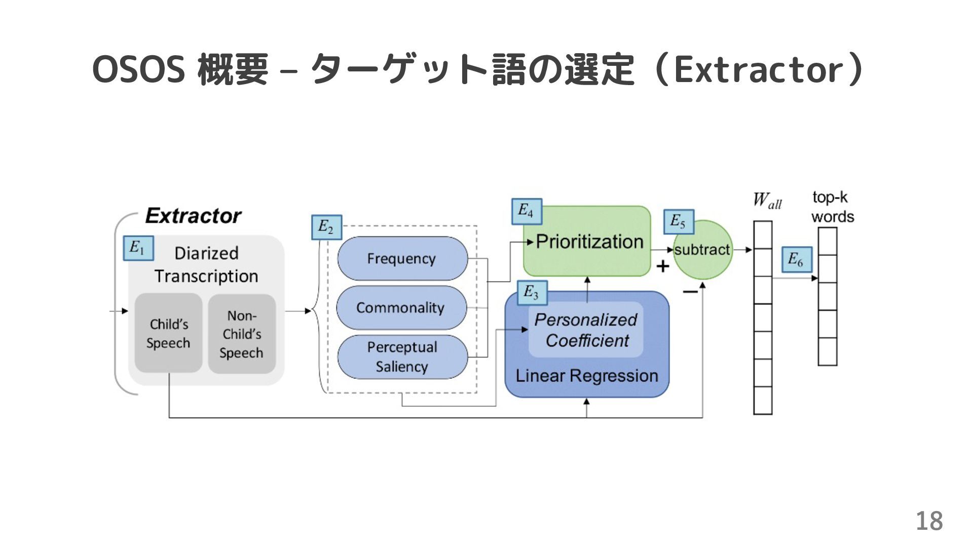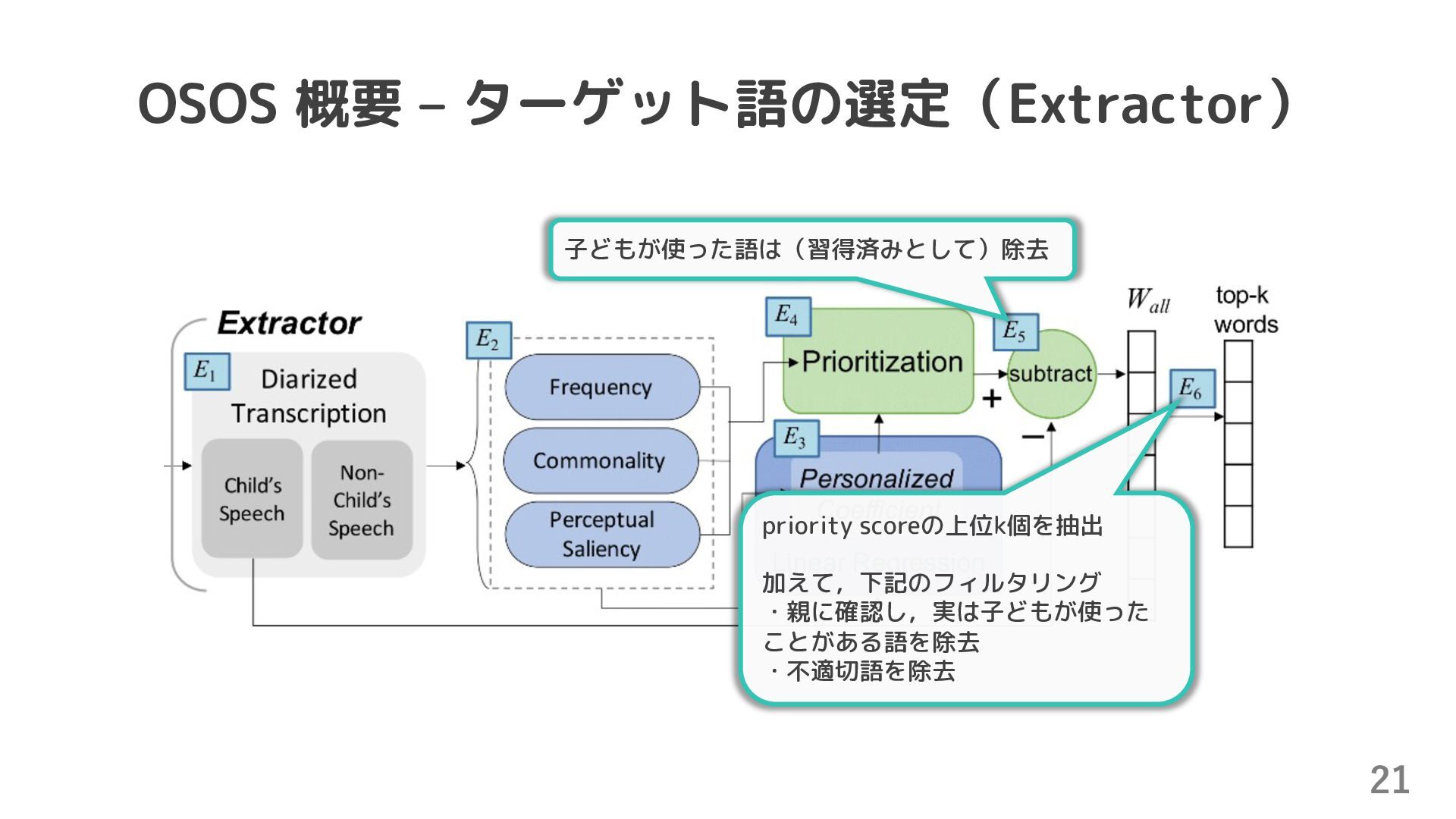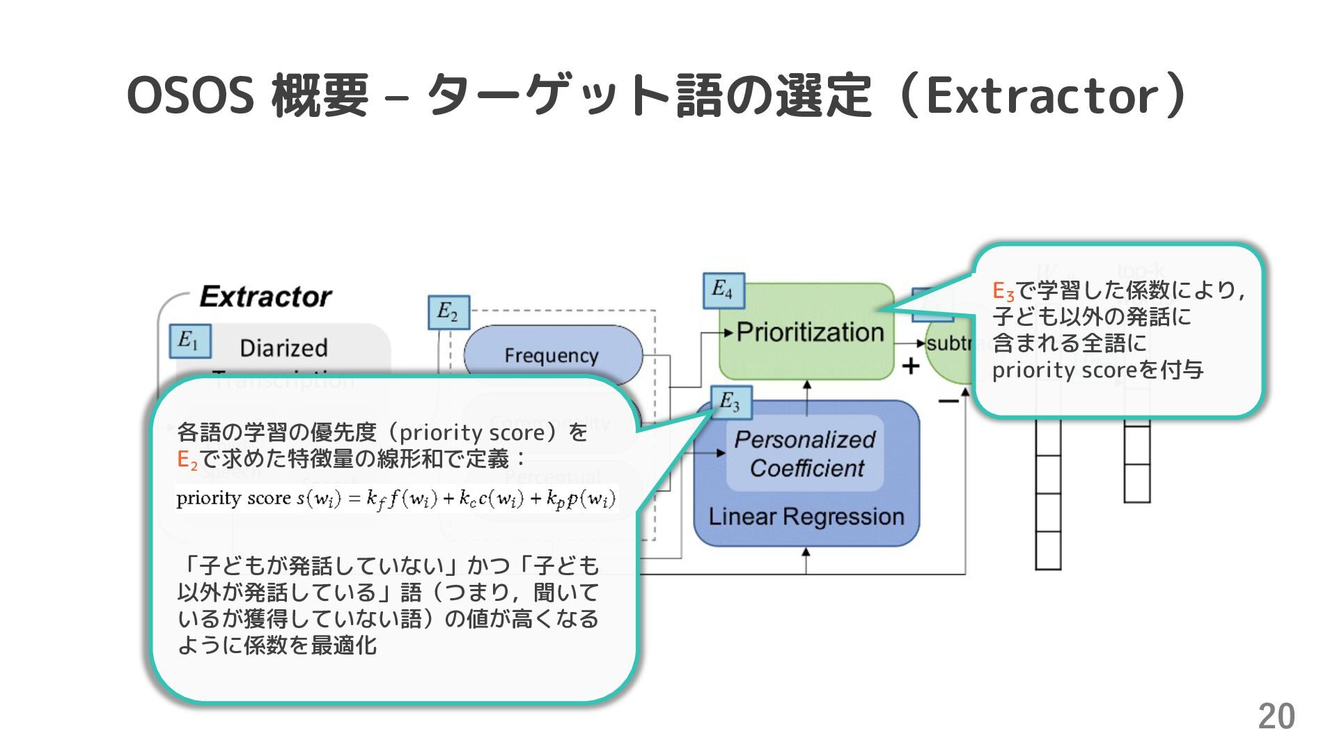 10. 20 OSOS 概要 – ターゲット語の選定(Extractor) E3 で学習した係数により, 子ども以外の発話に 含まれる全語に priority