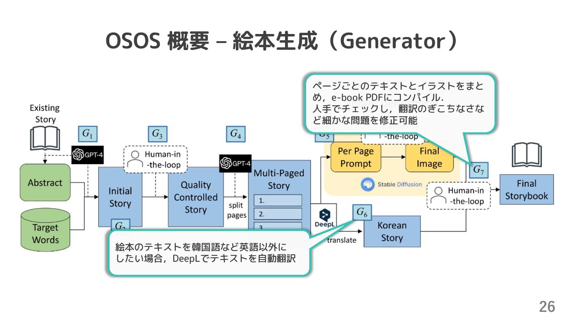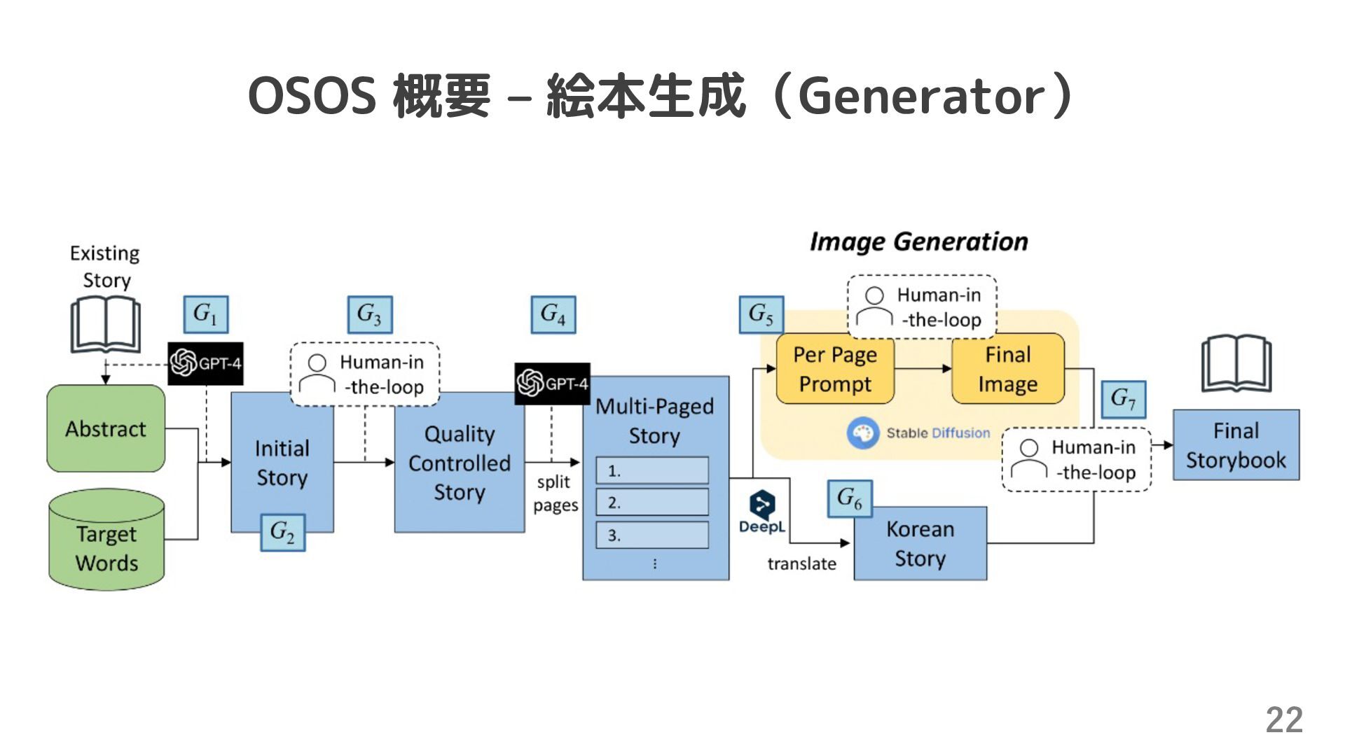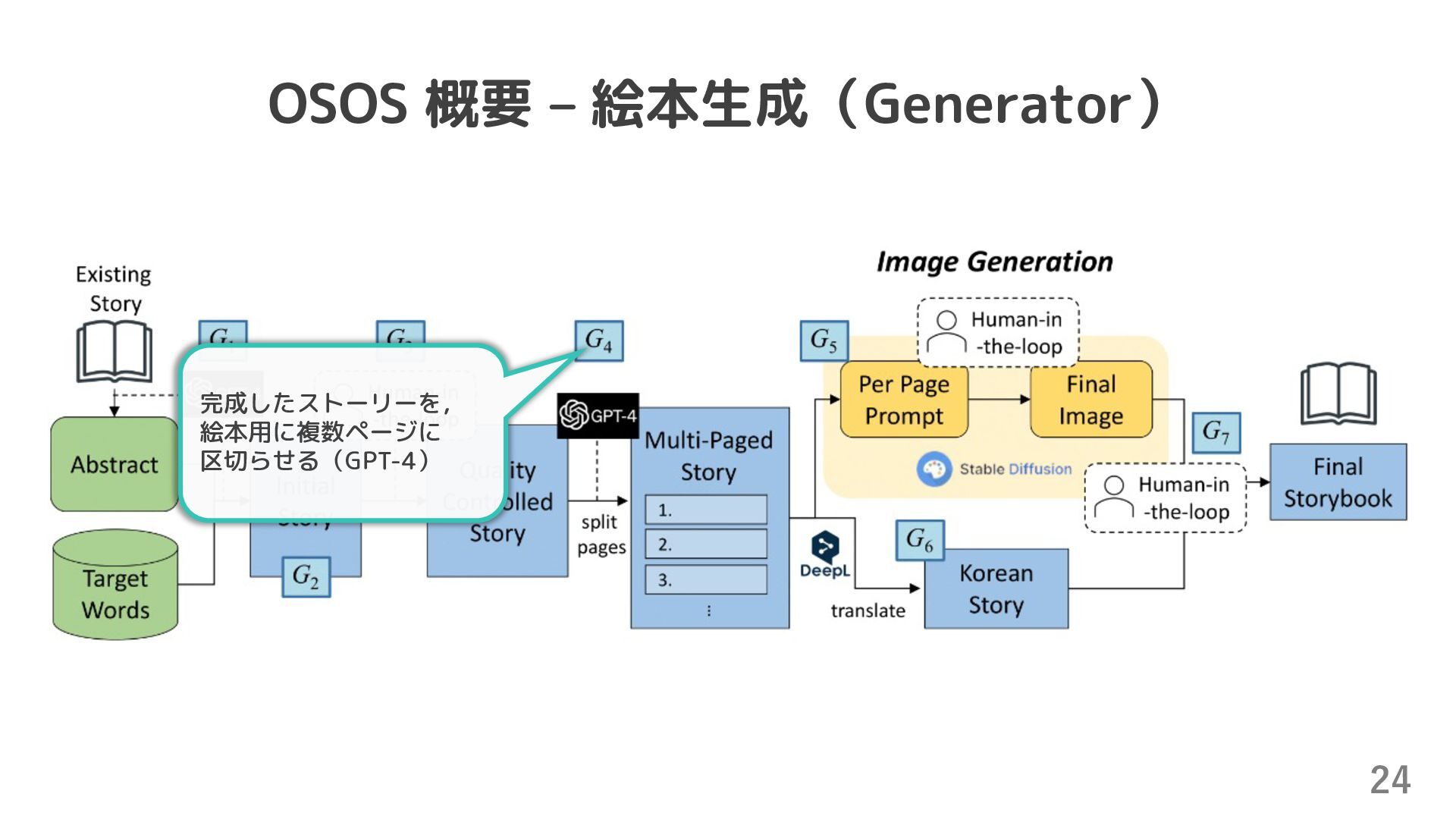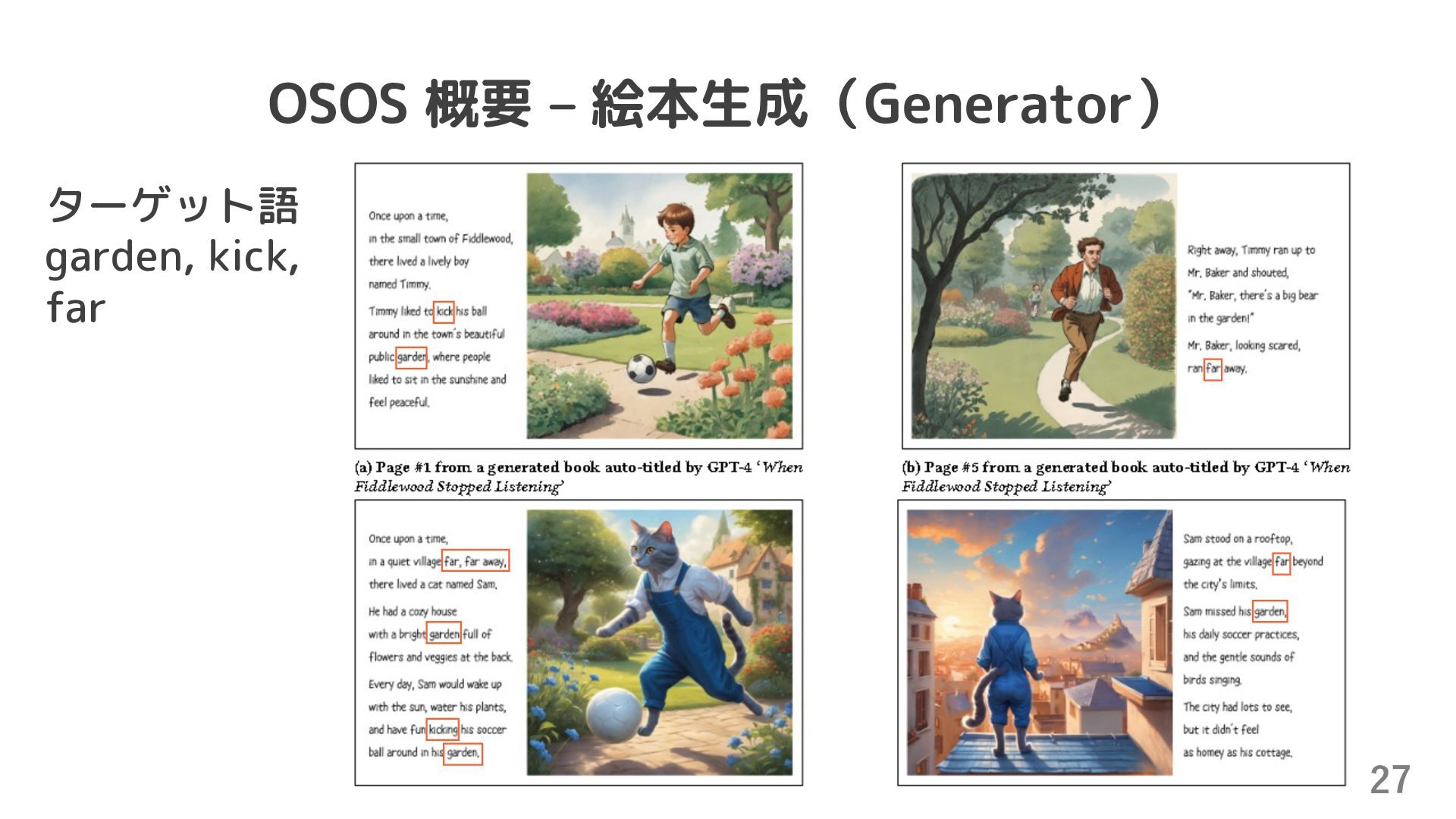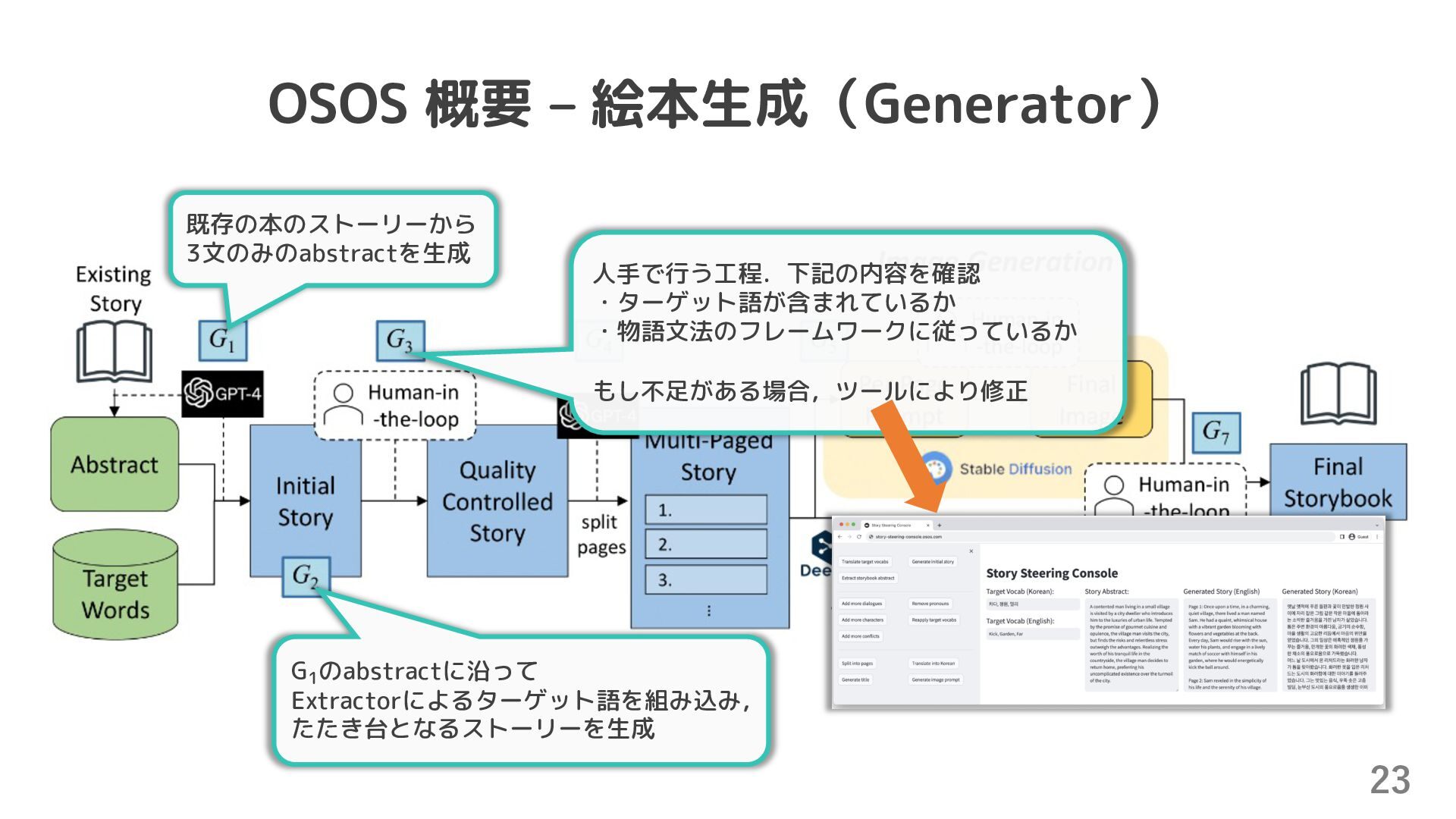 11. 23 OSOS 概要 – 絵本生成(Generator) 既存の本のストーリーから 3文のみのabstractを生成 人手で行う工程.下記の内容を確認 ・ターゲット語が含まれているか ・物語文法のフレームワークに従っているか