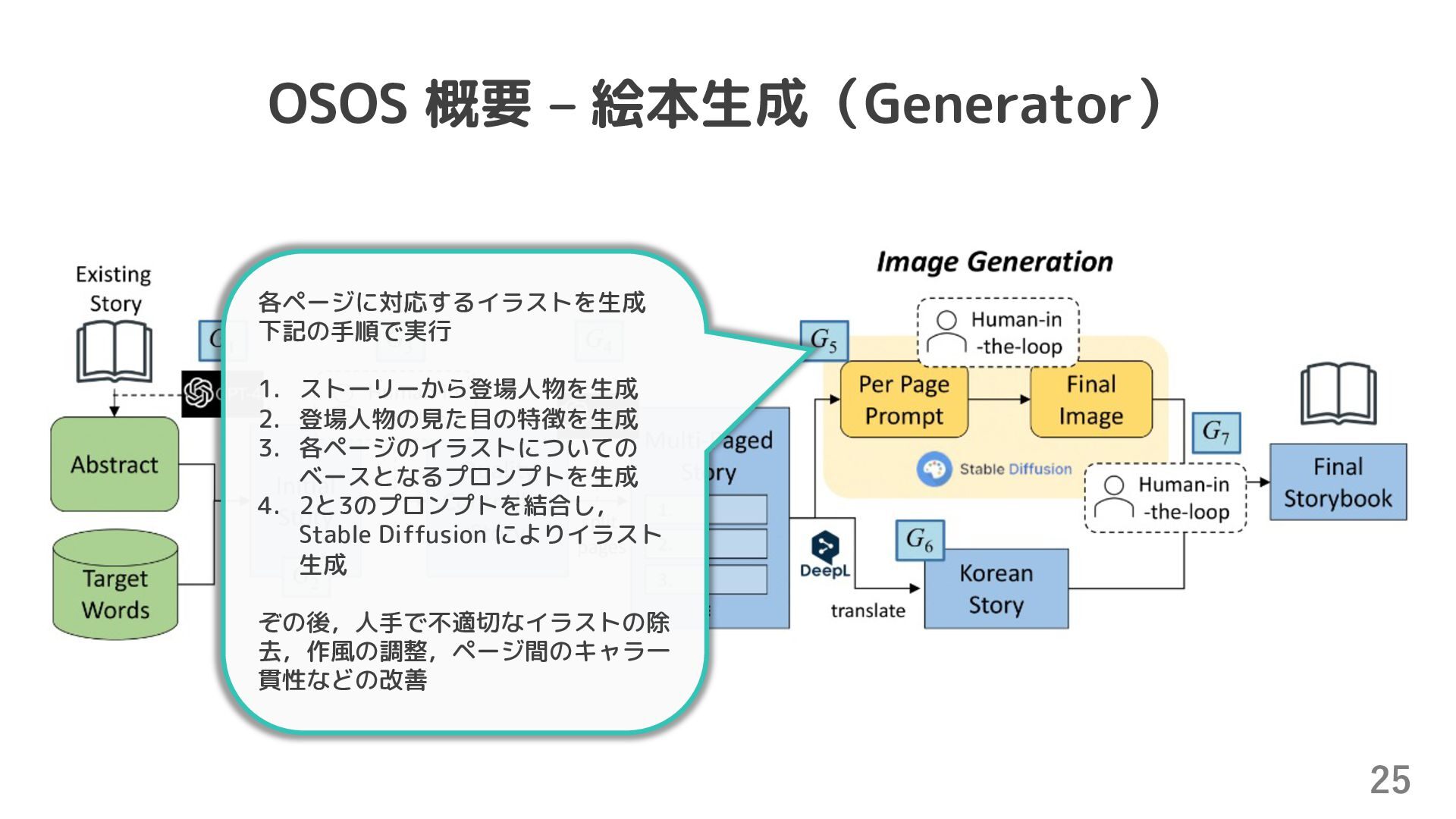 12. 25 OSOS 概要 – 絵本生成(Generator) 各ページに対応するイラストを生成 下記の手順で実行 1. ストーリーから登場人物を生成 2.