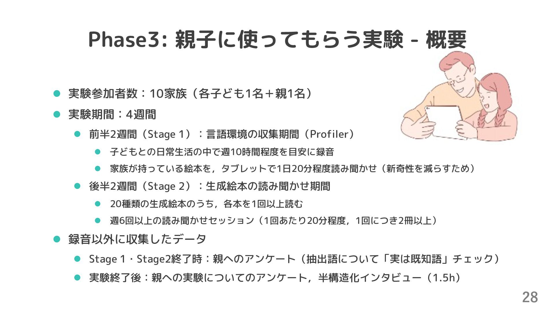 13. 28 Phase3: 親子に使ってもらう実験 - 概要 l 実験参加者数:10家族(各子ども1名+親1名) l 実験期間:4週間 l