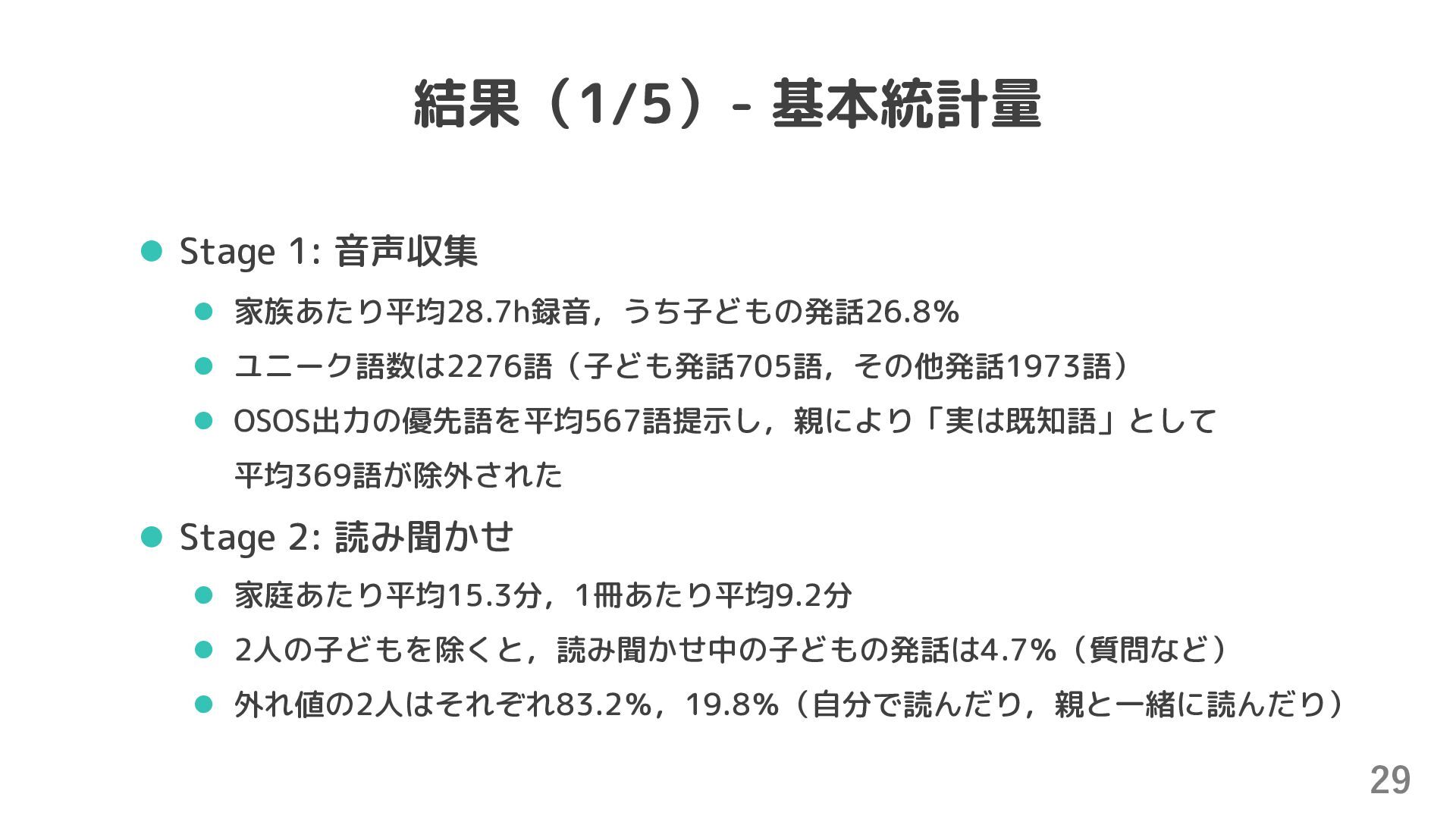 14. 29 結果(1/5)- 基本統計量 l Stage 1: 音声収集 l 家族あたり平均28.7h録音,うち子どもの発話26.8% l