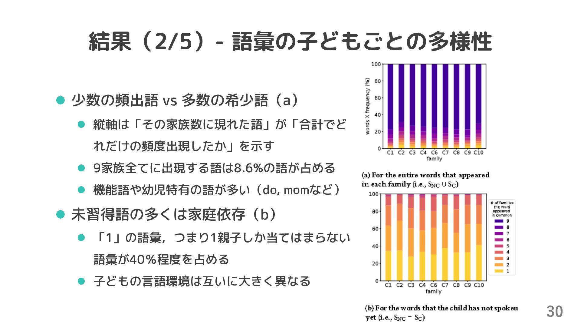 l 9家族全てに出現する語は8.6%の語が占める l 機能語や幼児特有の語が多い(do, momなど) l 未習得語の多くは家庭依存(b) l 「1」の語彙,つまり1親子しか当てはまらない 語彙が40%程度を占める l 子どもの言語環境は互いに大きく異なる