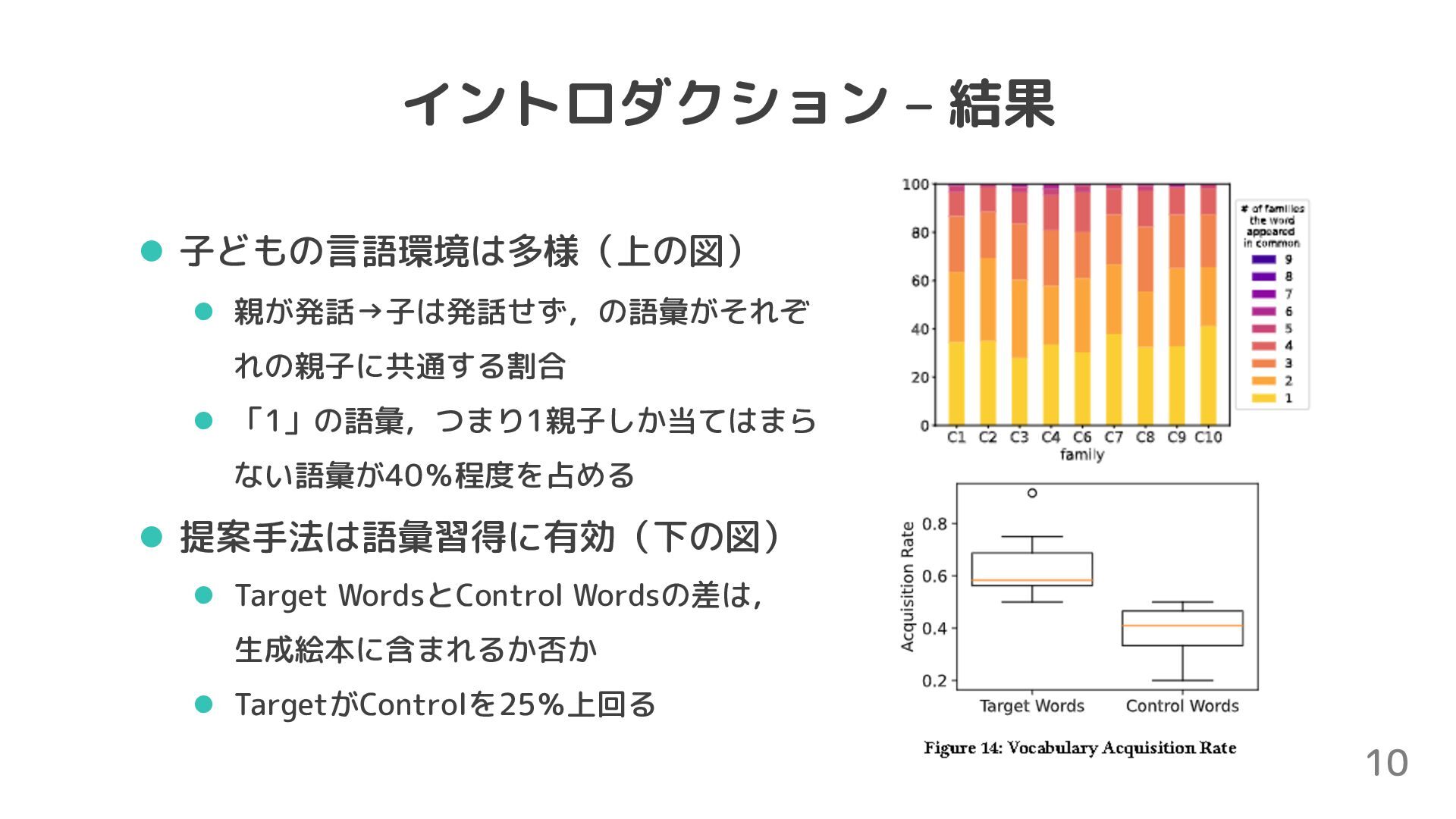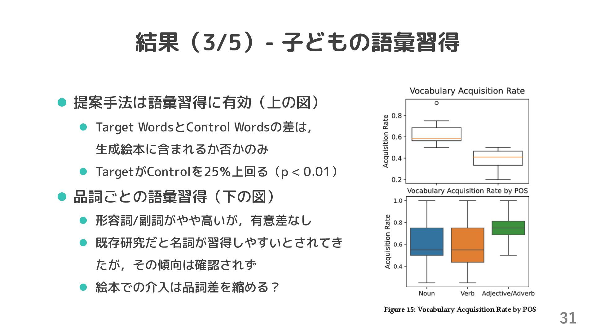 「1」の語彙,つまり1親子しか当てはまら ない語彙が40%程度を占める l 提案手法は語彙習得に有効(下の図) l Target WordsとControl Wordsの差は, 生成絵本に含まれるか否か l TargetがControlを25%上回る