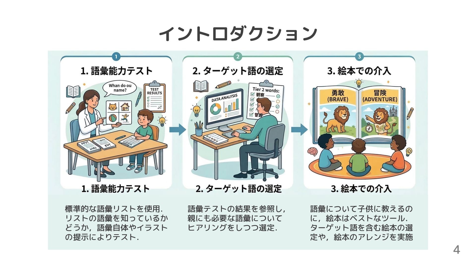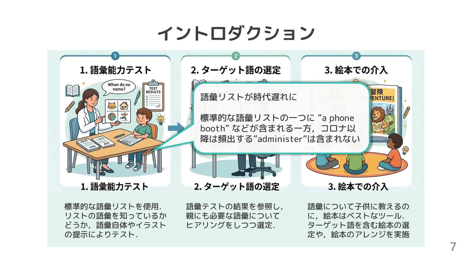 3. イントロダクション 6 標準的な語彙リストを使用. リストの語彙を知っているか どうか,語彙自体やイラスト の提示によりテスト. 語彙テストの結果を参照し, 親にも必要な語彙について ヒアリングをしつつ選定. 語彙について子供に教えるの