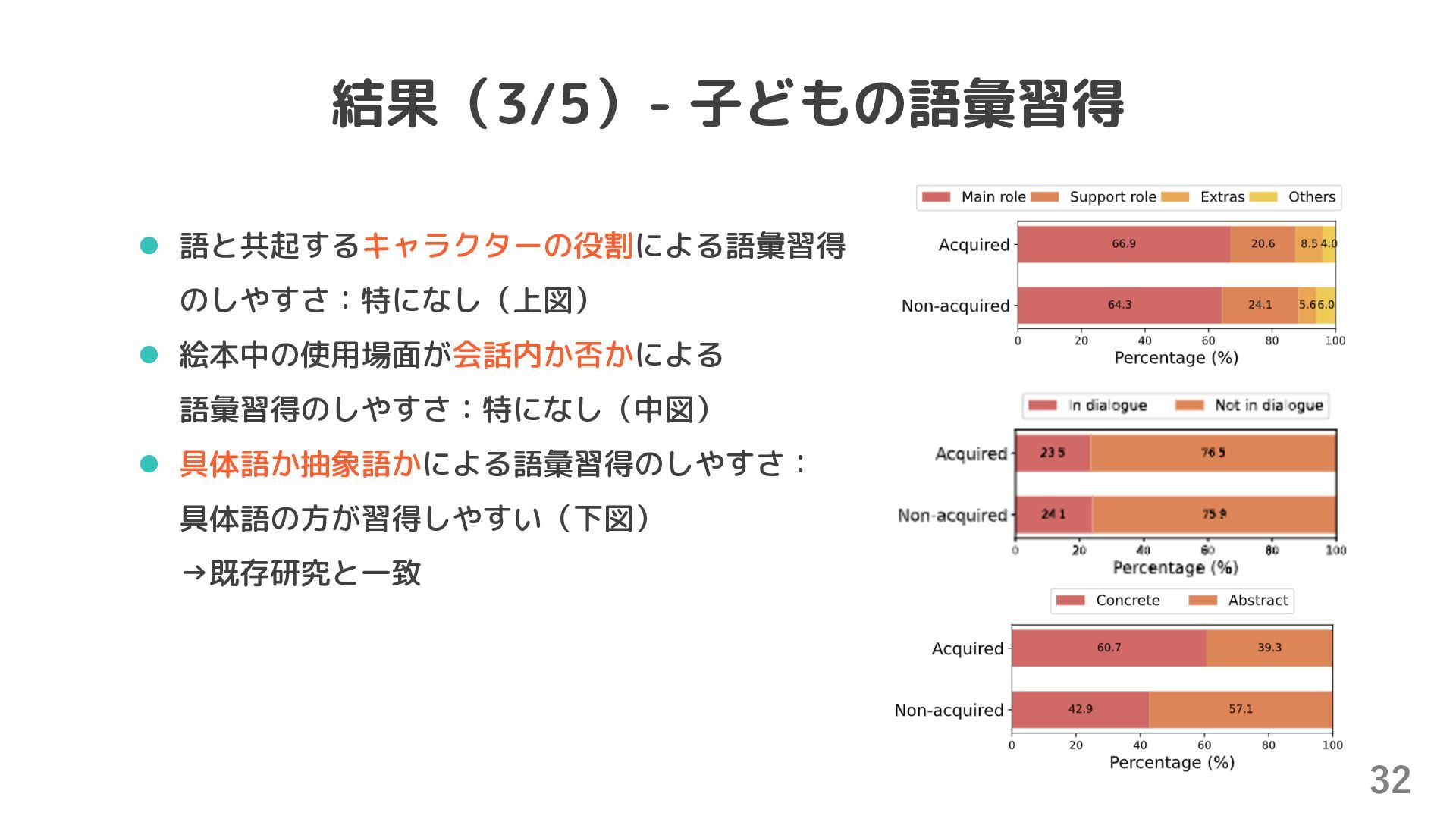 ユニーク語数は2276語(子ども発話705語,その他発話1973語) l OSOS出力の優先語を平均567語提示し,親により「実は既知語」として 平均369語が除外された l Stage 2: 読み聞かせ l 家庭あたり平均15.3分,1冊あたり平均9.2分 l 2人の子どもを除くと,読み聞かせ中の子どもの発話は4.7%(質問など) l 外れ値の2人はそれぞれ83.2%,19.8%(自分で読んだり,親と一緒に読んだり)