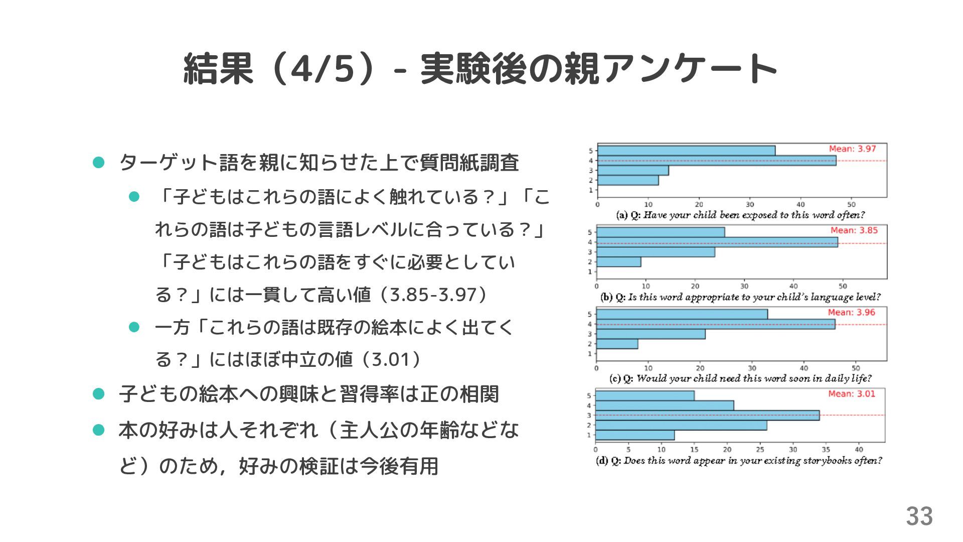 l 一方「これらの語は既存の絵本によく出てく る?」にはほぼ中立の値(3.01) l 子どもの絵本への興味と習得率は正の相関 l 本の好みは人それぞれ(主人公の年齢などな ど)のため,好みの検証は今後有用