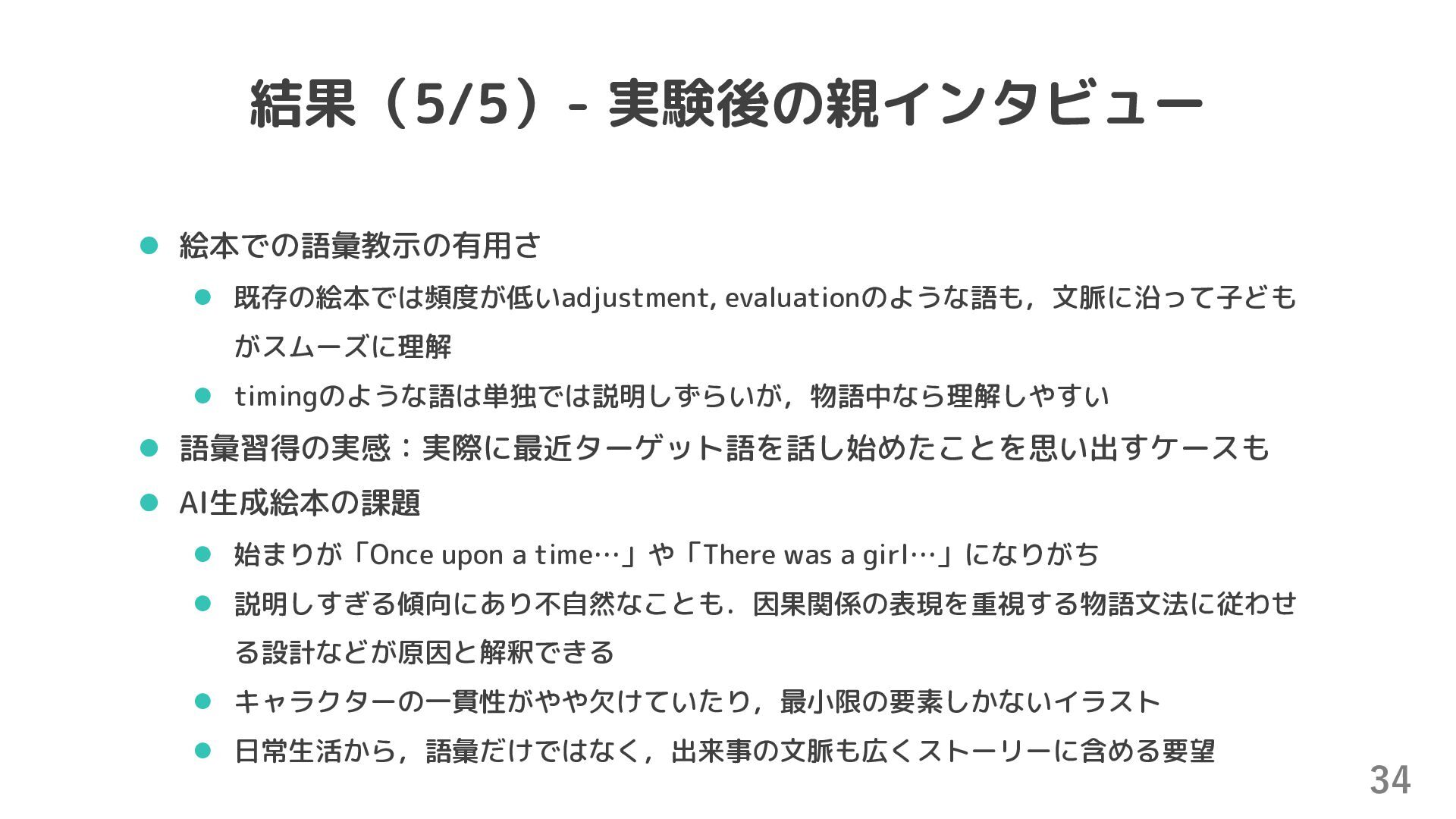timingのような語は単独では説明しずらいが,物語中なら理解しやすい l 語彙習得の実感:実際に最近ターゲット語を話し始めたことを思い出すケースも l AI生成絵本の課題 l 始まりが「Once upon a time…」や「There was a girl…」になりがち l 説明しすぎる傾向にあり不自然なことも.因果関係の表現を重視する物語文法に従わせ る設計などが原因と解釈できる l キャラクターの一貫性がやや欠けていたり,最小限の要素しかないイラスト l 日常生活から,語彙だけではなく,出来事の文脈も広くストーリーに含める要望