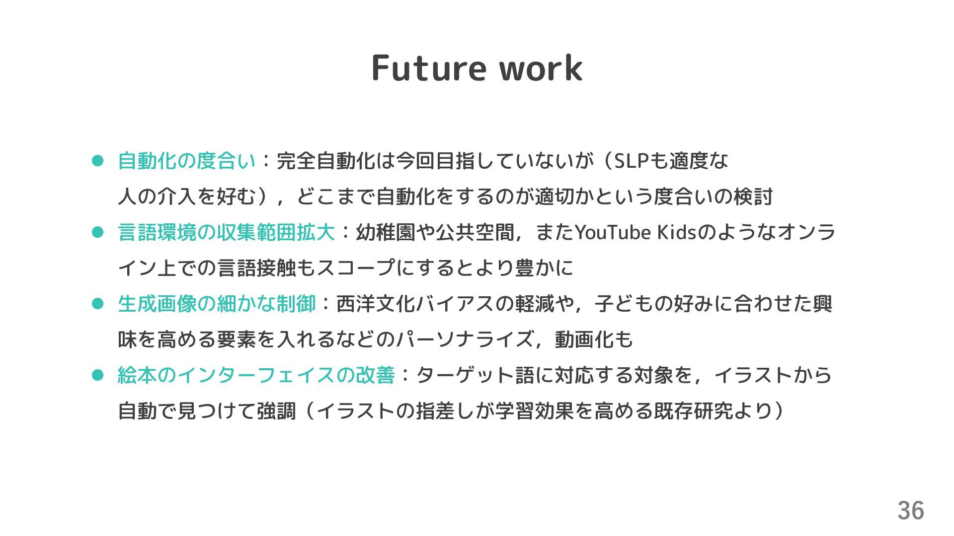 20. 36 Future work l 自動化の度合い:完全自動化は今回目指していないが(SLPも適度な 人の介入を好む),どこまで自動化をするのが適切かという度合いの検討 l 言語環境の収集範囲拡大:幼稚園や公共空間,またYouTube Kidsのようなオンラ イン上での言語接触もスコープにするとより豊かに
