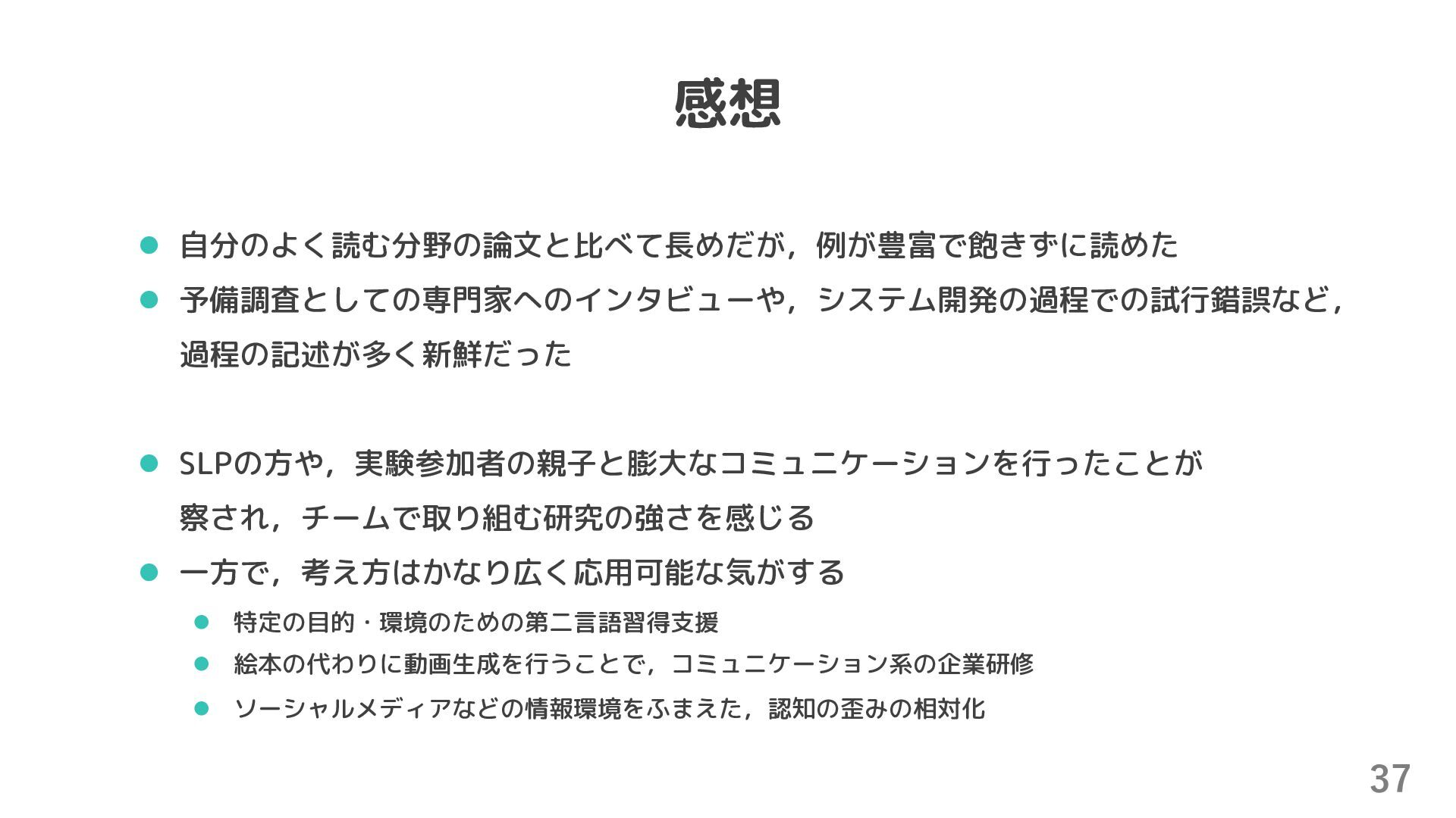 21. 37 感想 l 自分のよく読む分野の論文と比べて長めだが,例が豊富で飽きずに読めた l 予備調査としての専門家へのインタビューや,システム開発の過程での試行錯誤など, 過程の記述が多く新鮮だった l SLPの方や,実験参加者の親子と膨大なコミュニケーションを行ったことが 察され,チームで取り組む研究の強さを感じる
