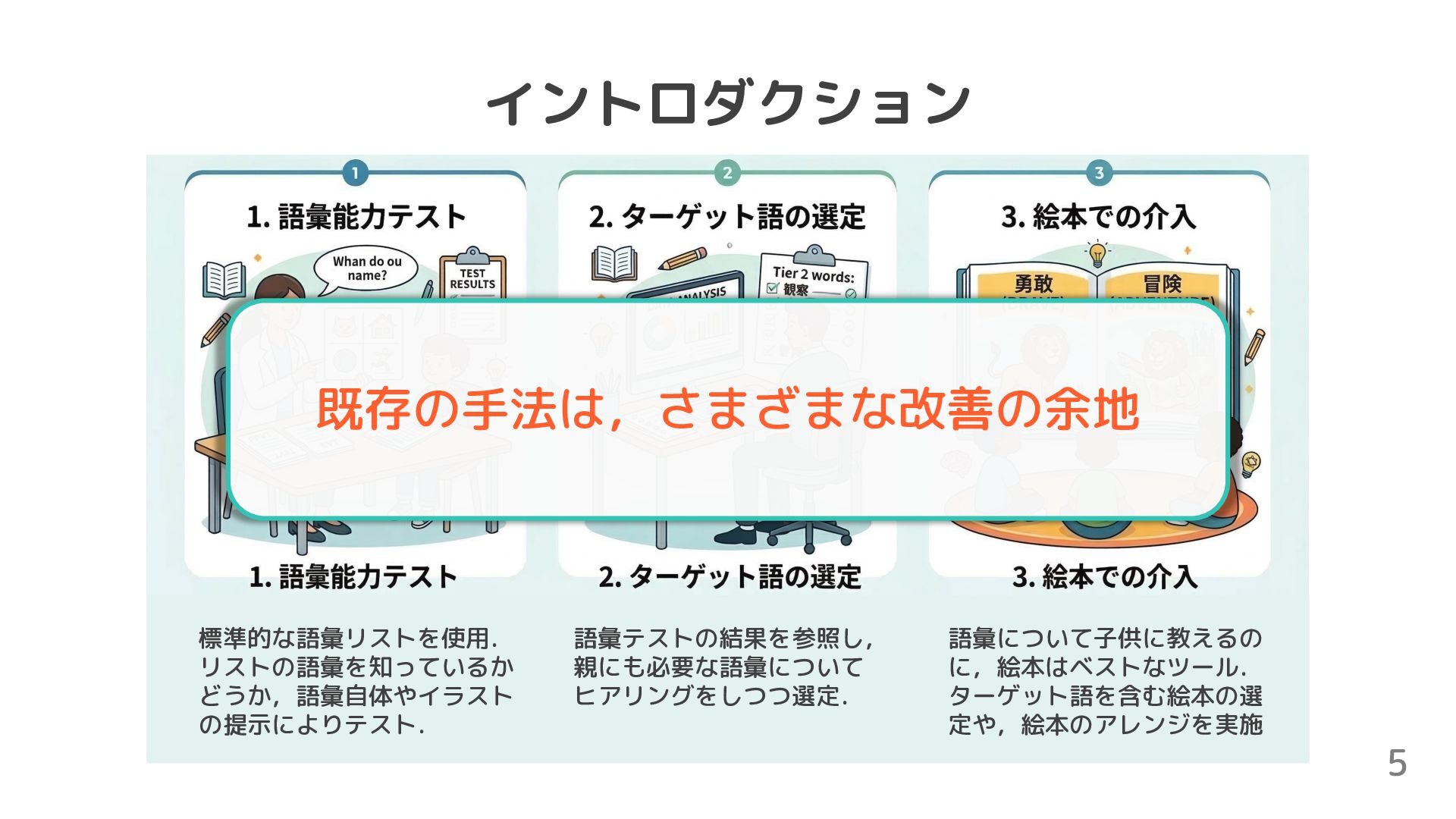 4. イントロダクション 7 標準的な語彙リストを使用. リストの語彙を知っているか どうか,語彙自体やイラスト の提示によりテスト. 語彙テストの結果を参照し, 親にも必要な語彙について ヒアリングをしつつ選定. 語彙について子供に教えるの