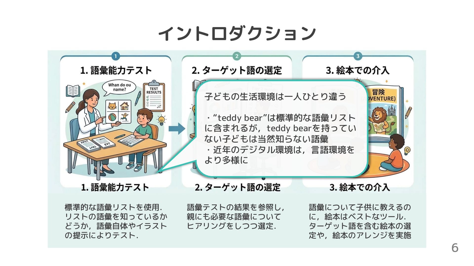 5. イントロダクション 8 標準的な語彙リストを使用. リストの語彙を知っているか どうか,語彙自体やイラスト の提示によりテスト. 語彙テストの結果を参照し, 親にも必要な語彙について ヒアリングをしつつ選定. 語彙について子供に教えるの