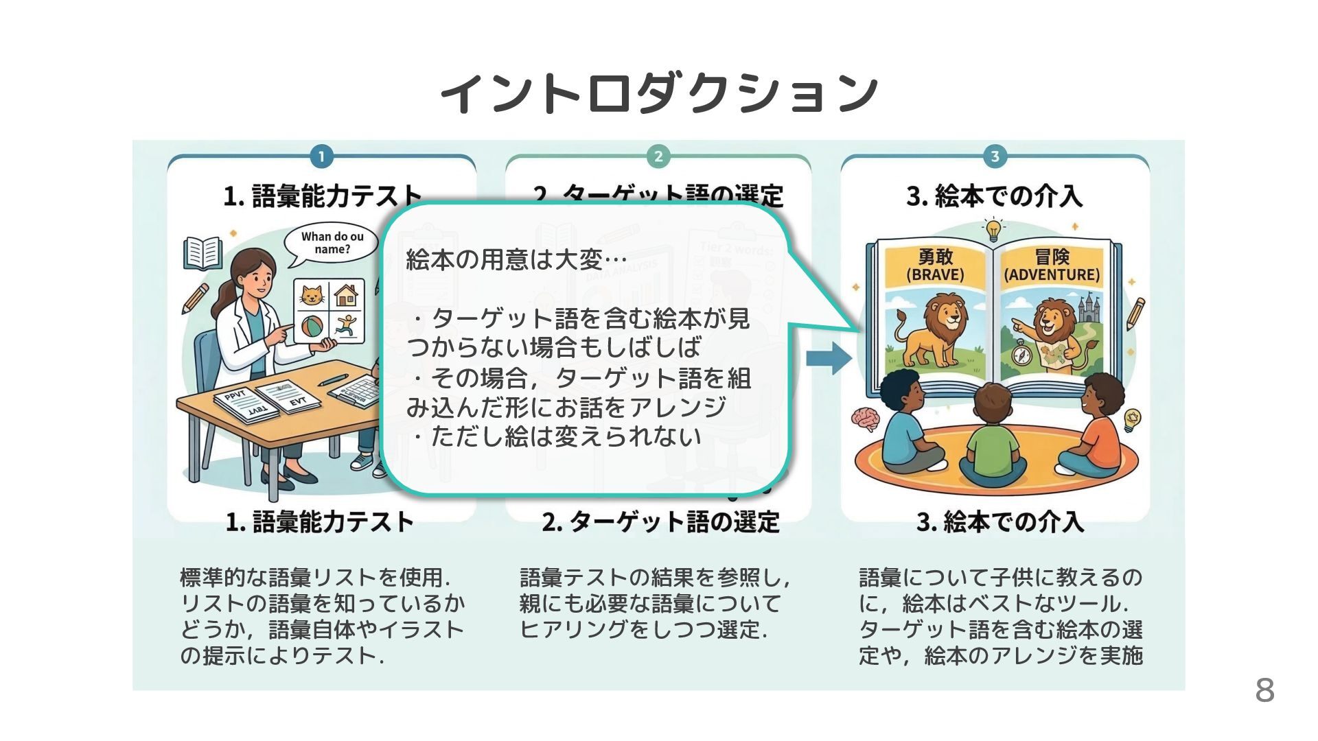な語彙の選定の基準が不明瞭 l 語について子どもに教える方法の限界:教材の欠如,オリジナル教材の作成の手間 l 絵本を使った語彙の介入:適切な絵本の不在,アレンジ時に絵は変えられない