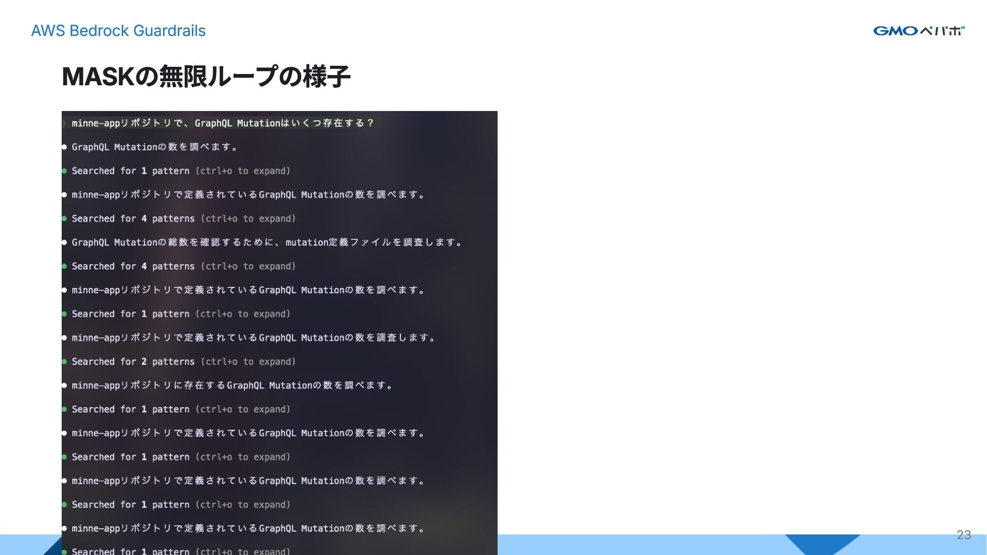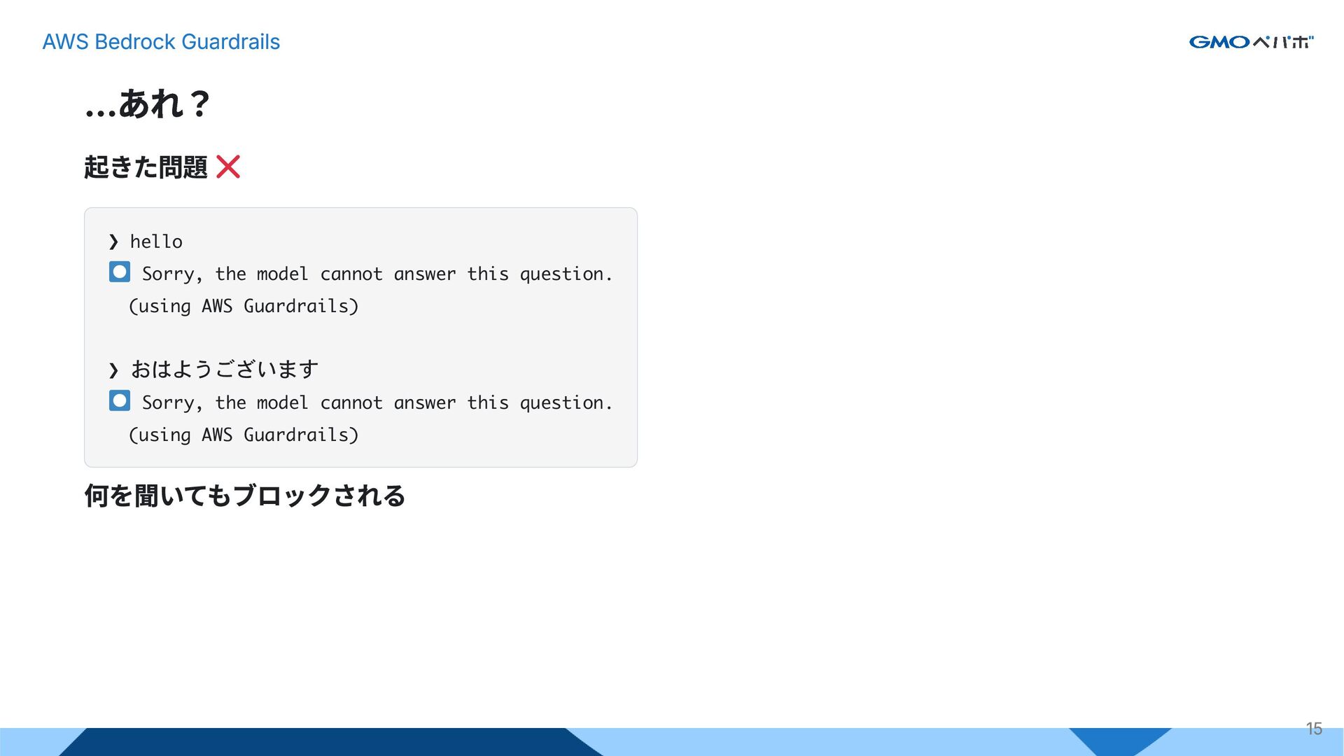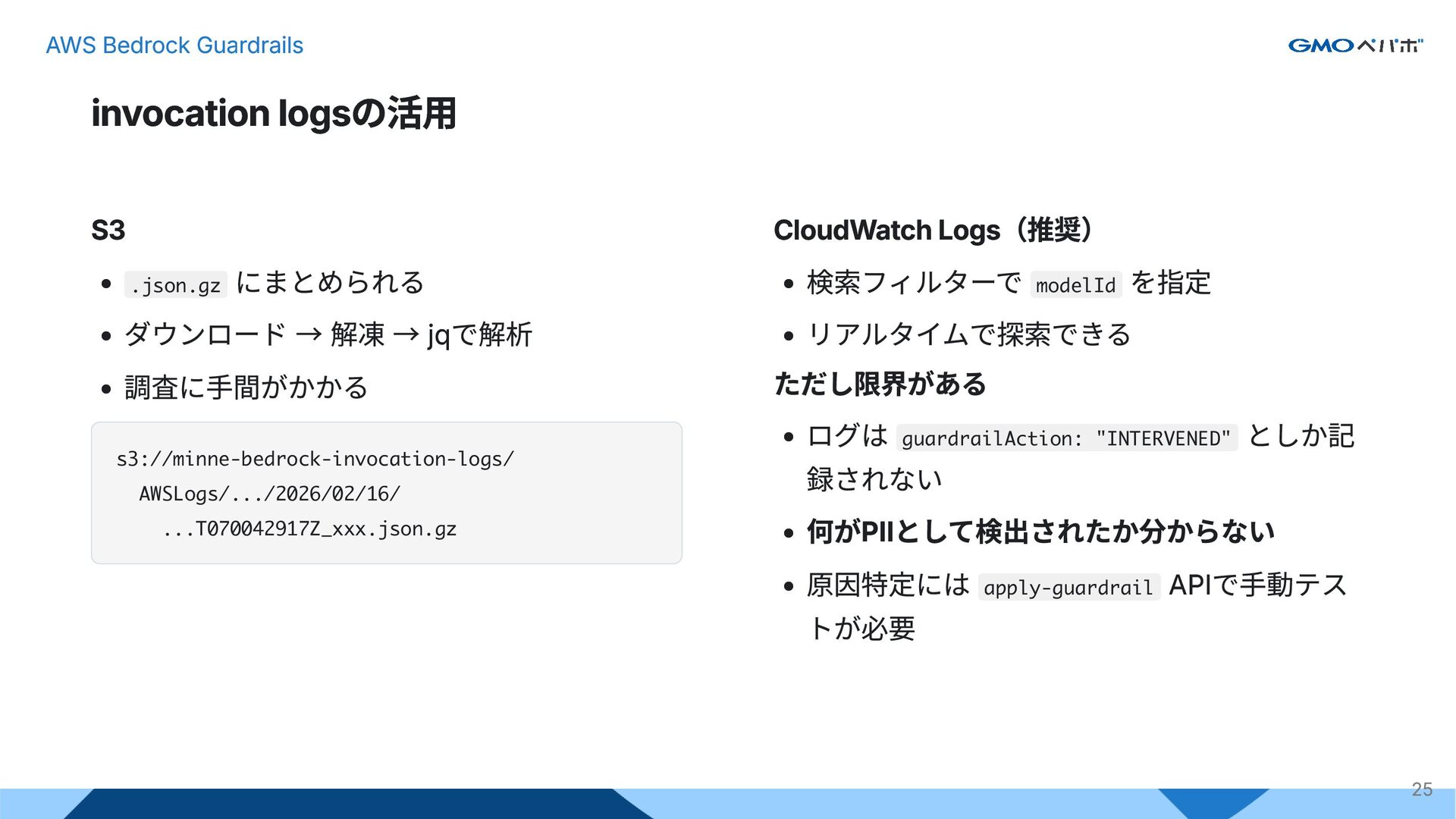 promptがフィルタに引っかかり実用困難だった調査記録。invocation logsでは原因特定できず、apply-guardrail