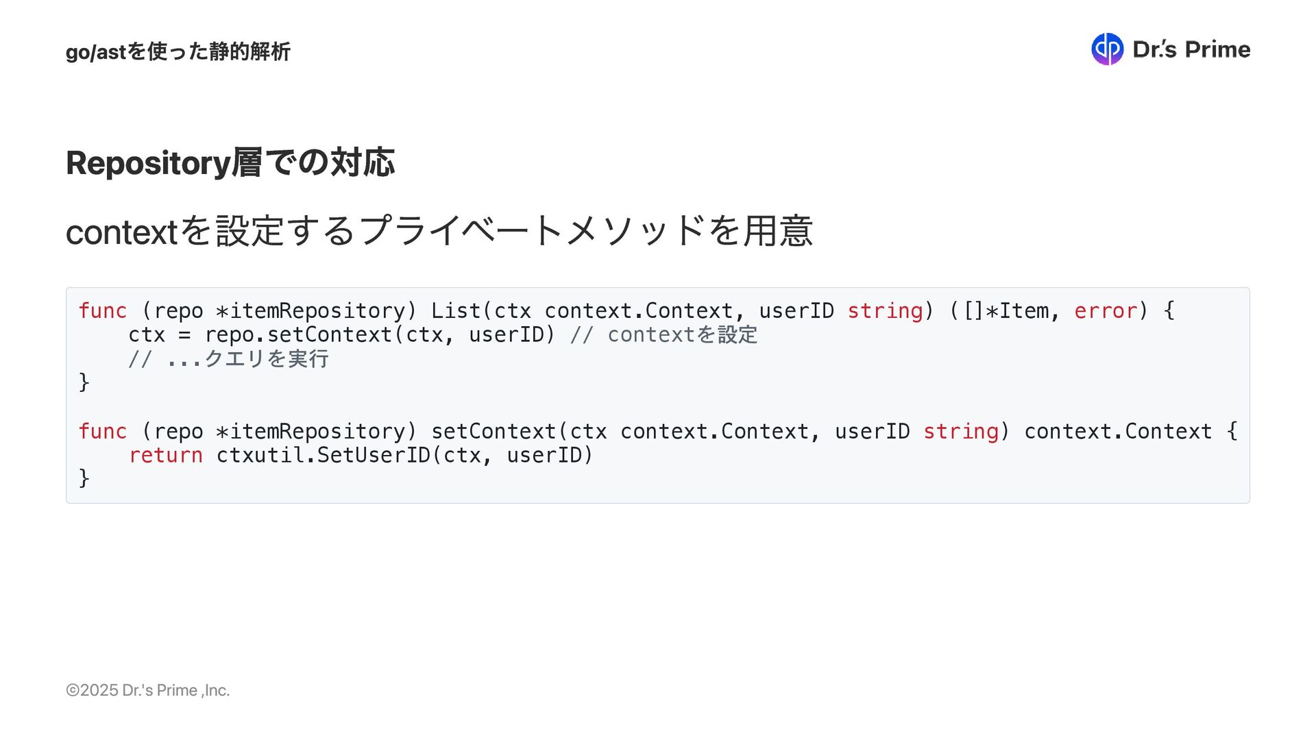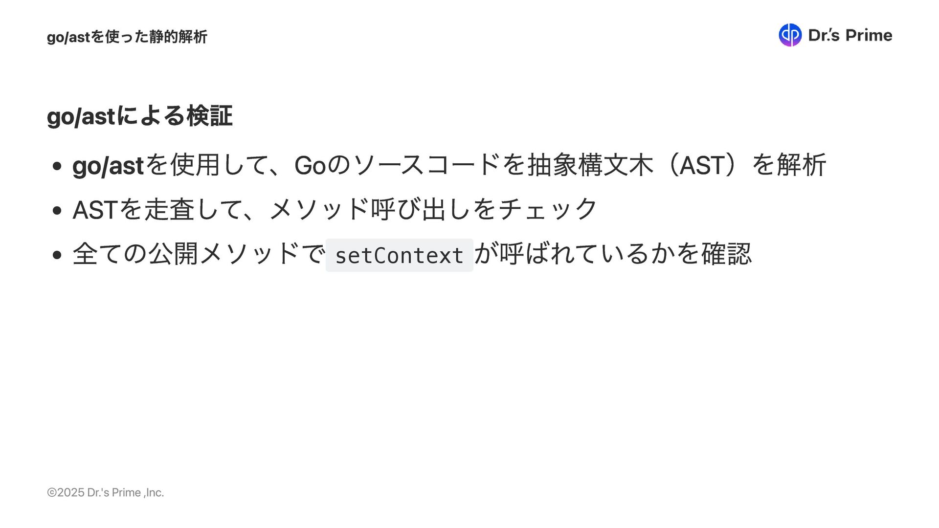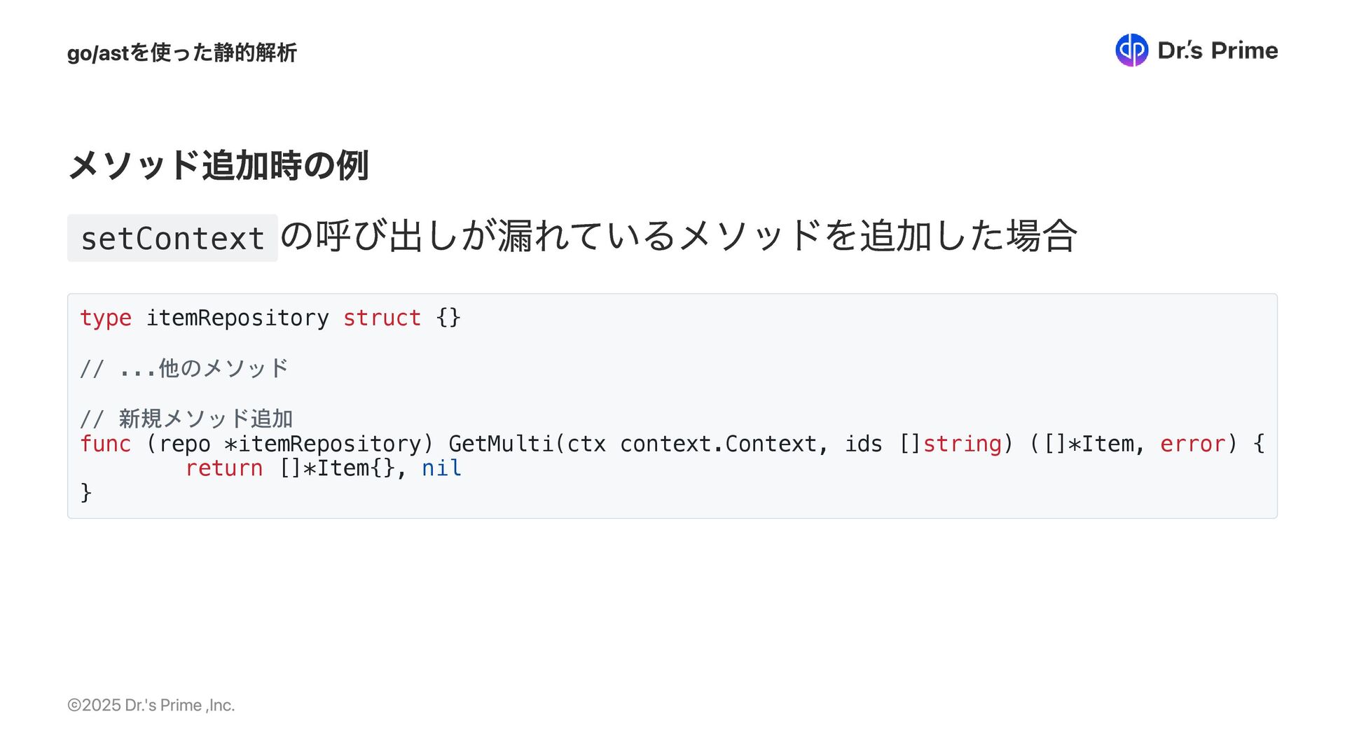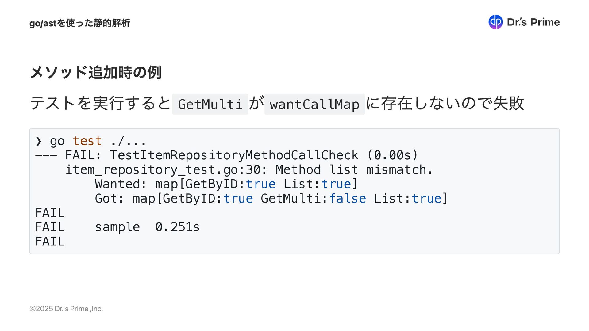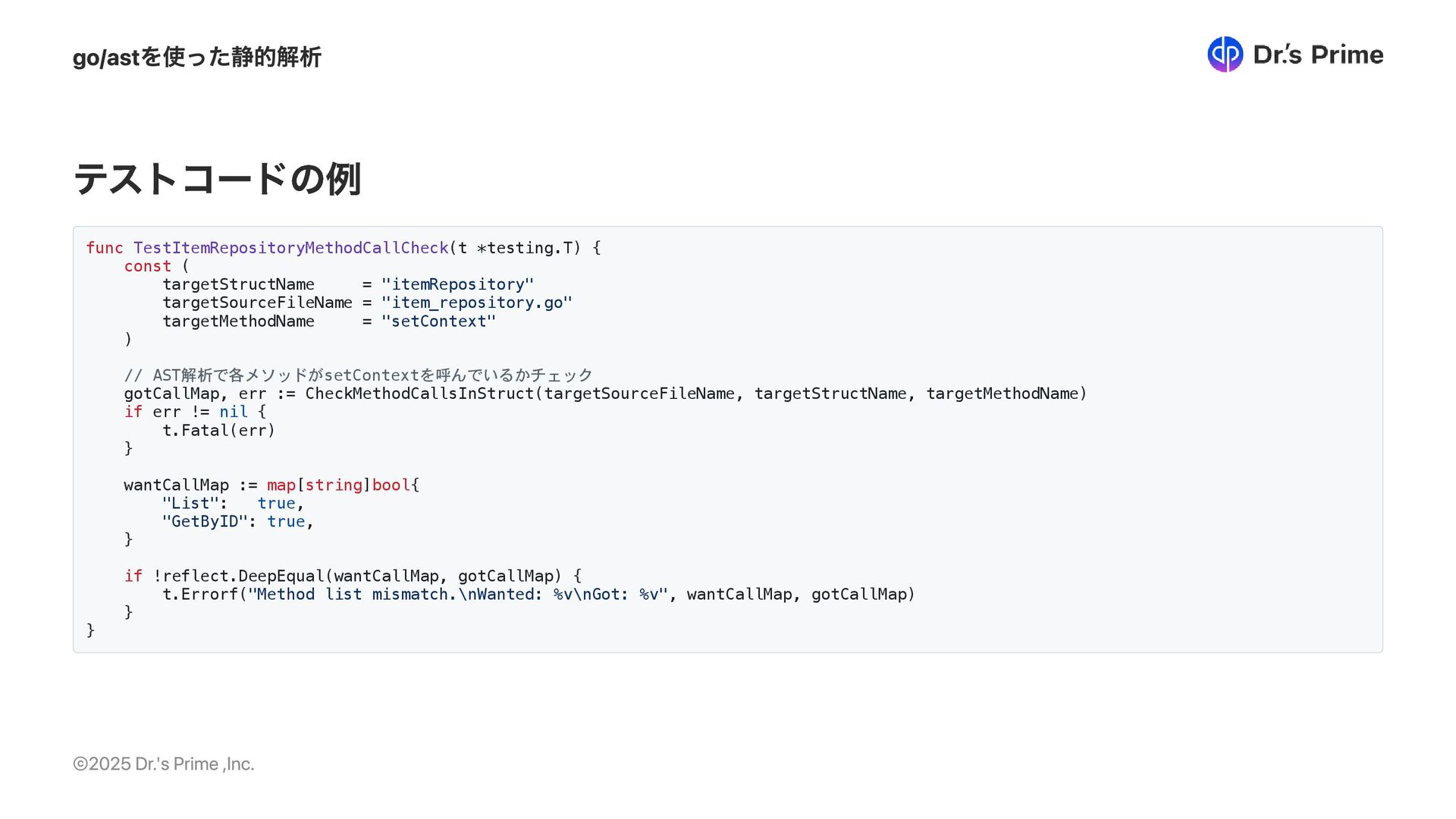 "itemRepository" targetSourceFileName = "item_repository.go" targetMethodName = "setContext" ) // AST解析で各メソッドがsetContextを呼んでいるかチェック gotCallMap, err := CheckMethodCallsInStruct(targetSourceFileName, targetStructName, targetMethodName) if err != nil { t.Fatal(err) } wantCallMap := map[string]bool{ "List": true, "GetByID": true, } if !reflect.DeepEqual(wantCallMap, gotCallMap) { t.Errorf("Method list mismatch.\nWanted: %v\nGot: %v", wantCallMap, gotCallMap) } } ©2025 Dr.'s Prime ,Inc.