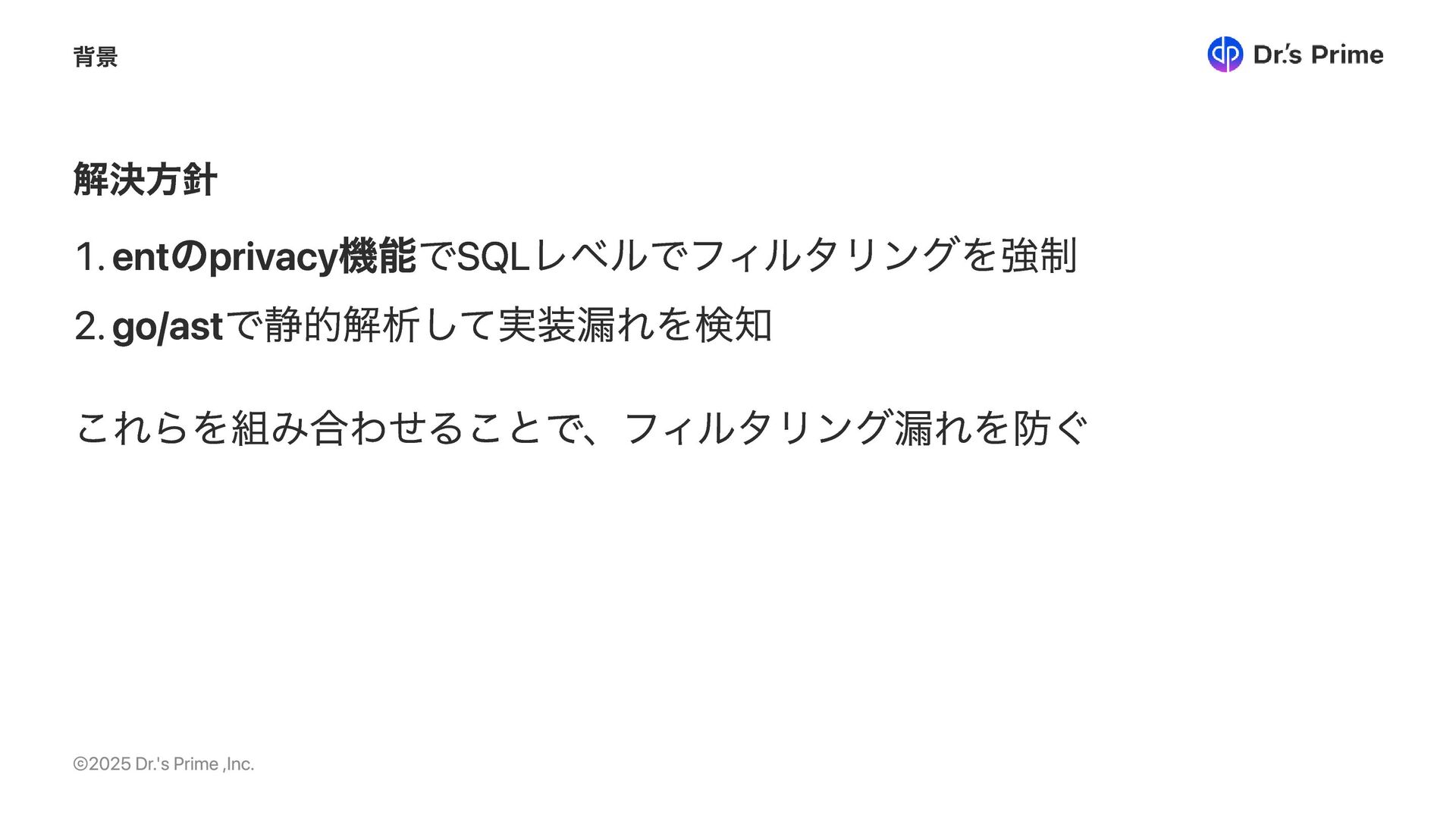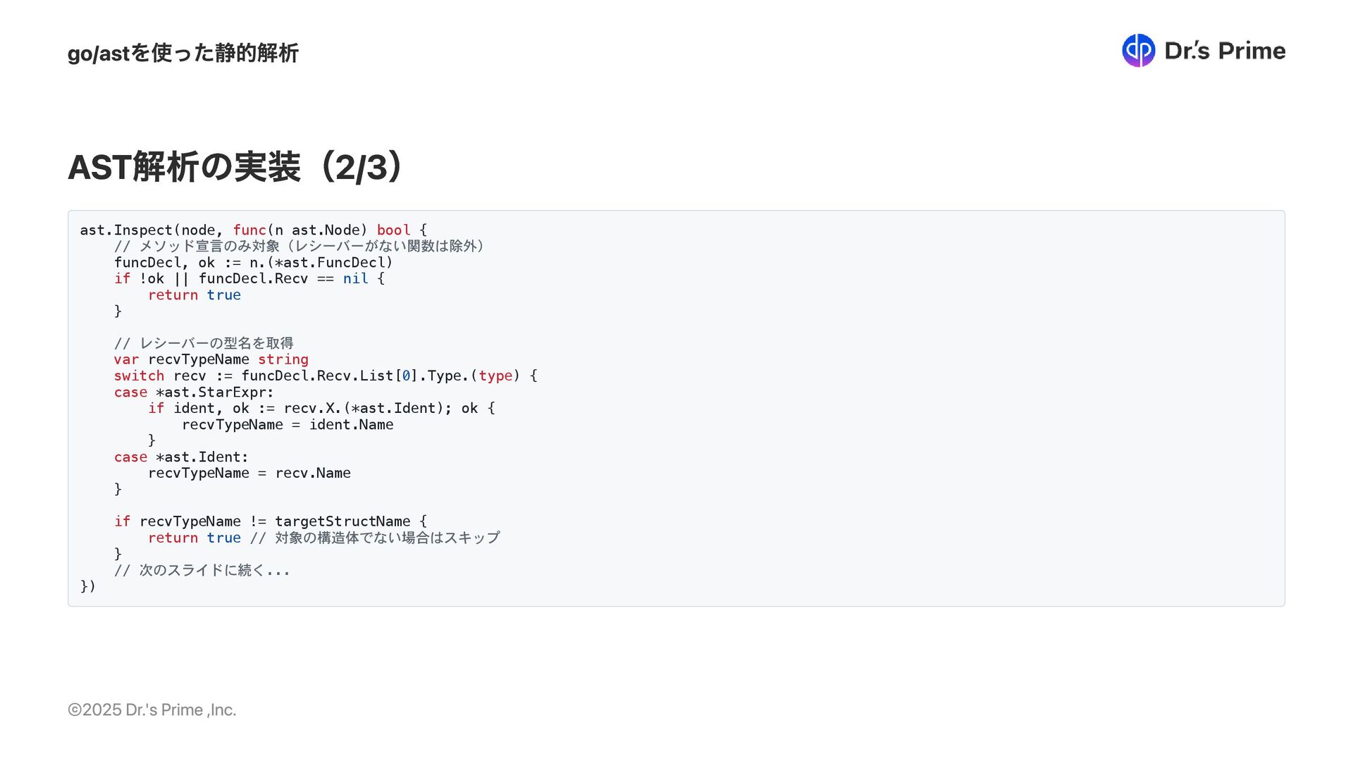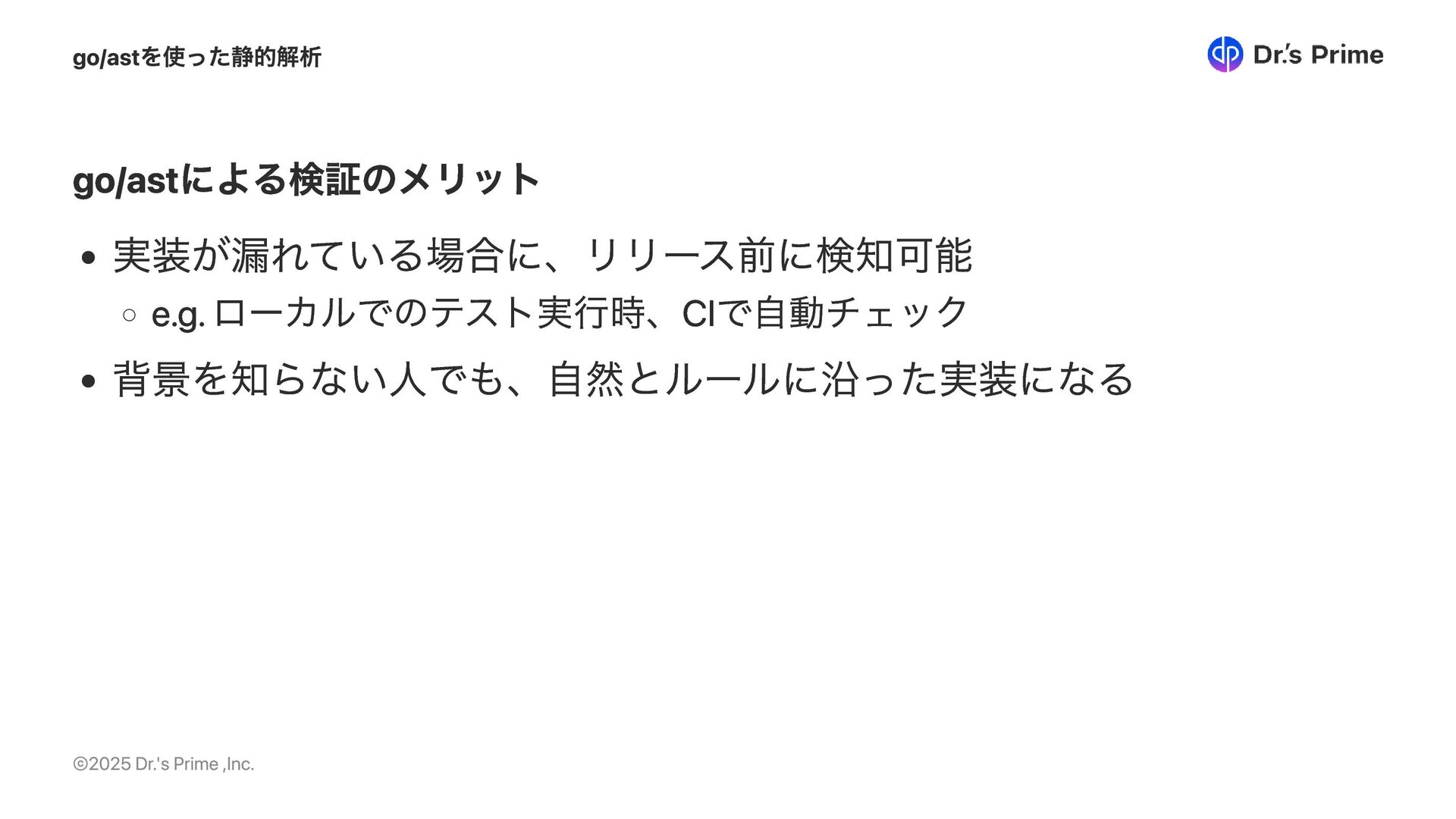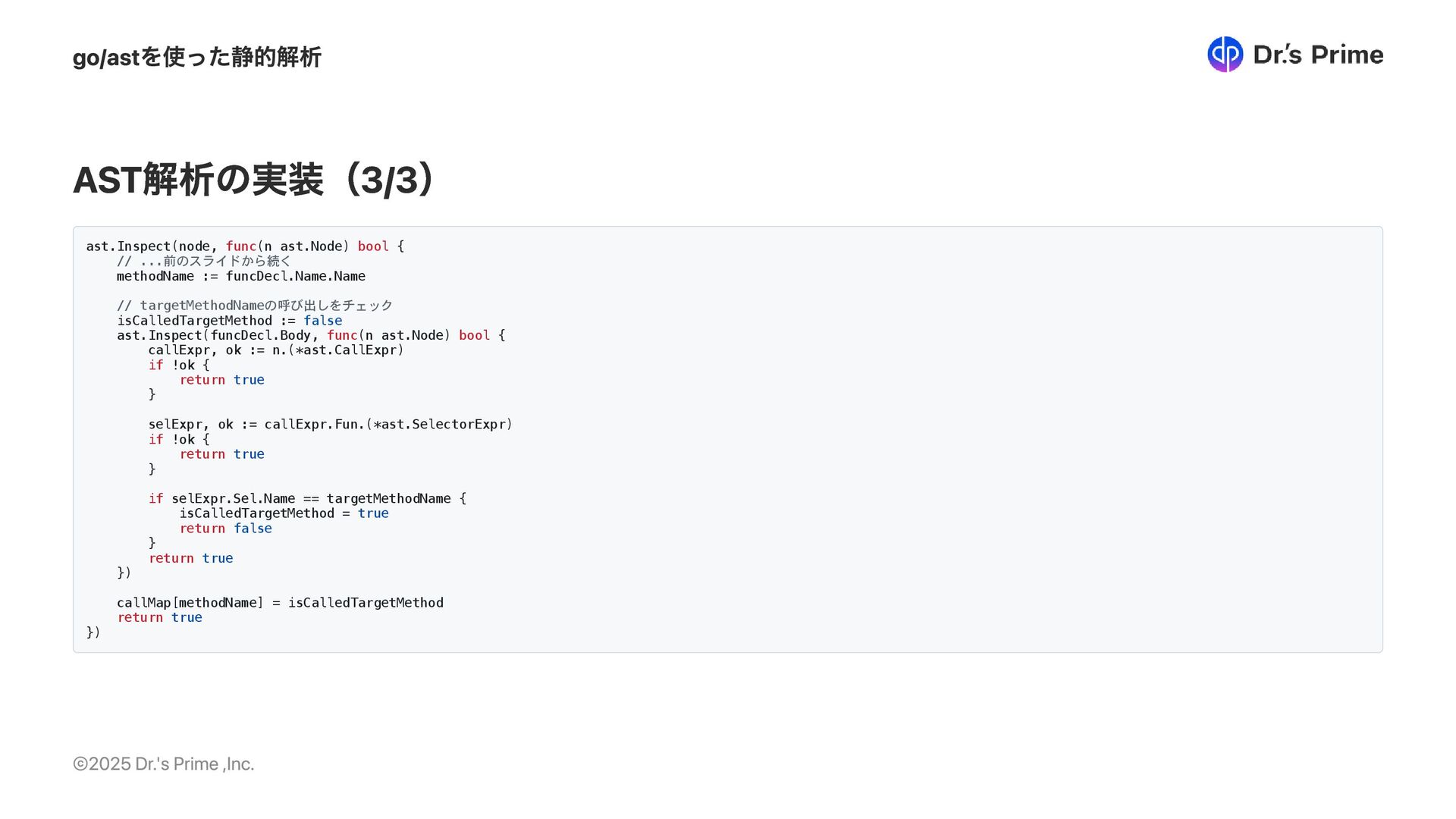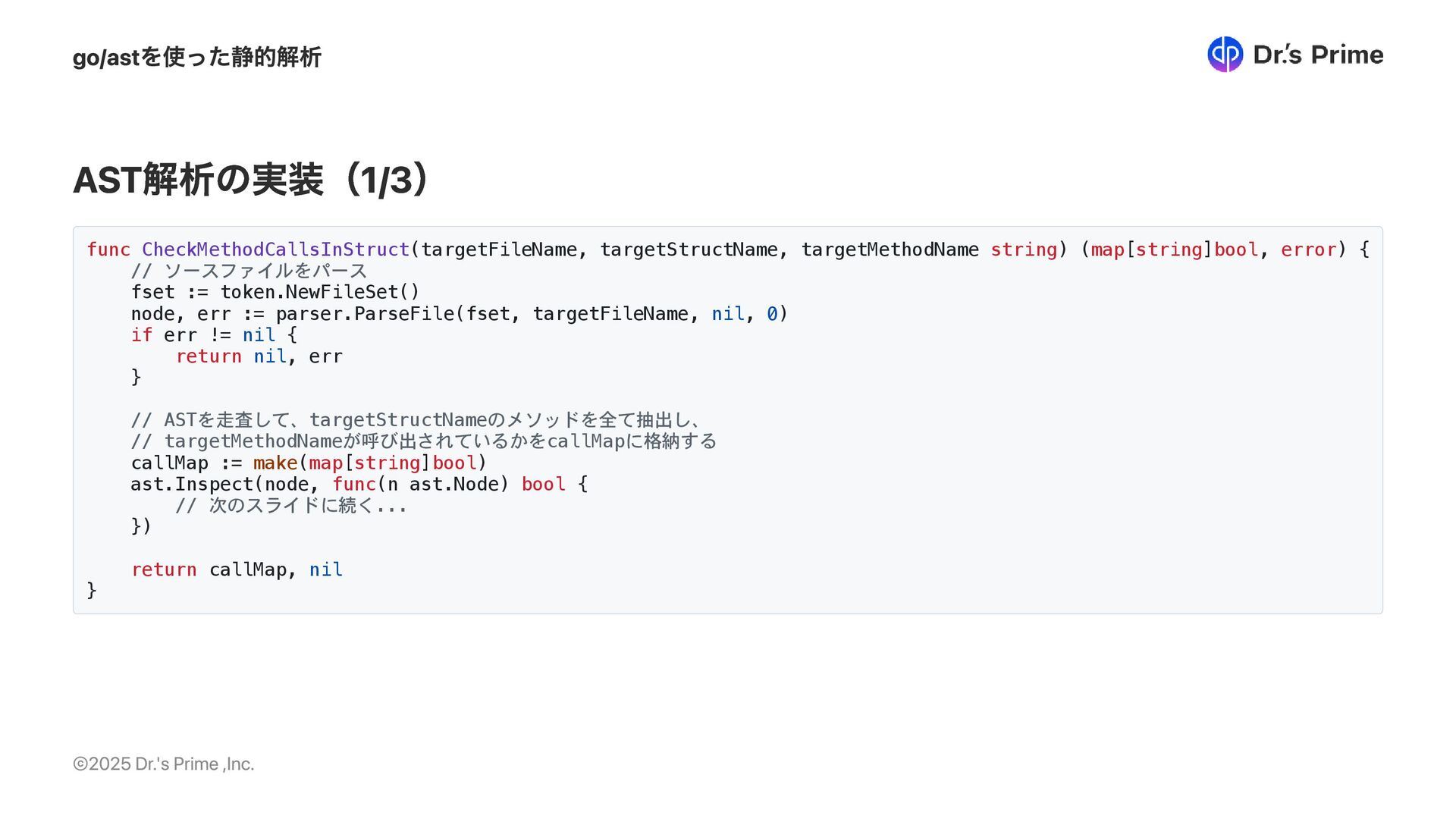 "itemRepository" targetSourceFileName = "item_repository.go" targetMethodName = "setContext" ) // AST解析で各メソッドがsetContextを呼んでいるかチェック gotCallMap, err := CheckMethodCallsInStruct(targetSourceFileName, targetStructName, targetMethodName) if err != nil { t.Fatal(err) } wantCallMap := map[string]bool{ "List": true, "GetByID": true, } if !reflect.DeepEqual(wantCallMap, gotCallMap) { t.Errorf("Method list mismatch.\nWanted: %v\nGot: %v", wantCallMap, gotCallMap) } } ©2025 Dr.'s Prime ,Inc.