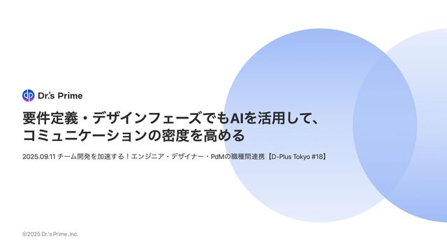 要件定義・デザインフェーズでもAIを活用して、 コミュニケーションの密度を高める 2025.09.11 チーム開発を加速する!エンジニア・デザイナー・PdMの職種間連携【D-Plus Tokyo #18】 ©2025 Dr.'s Prime ,Inc.