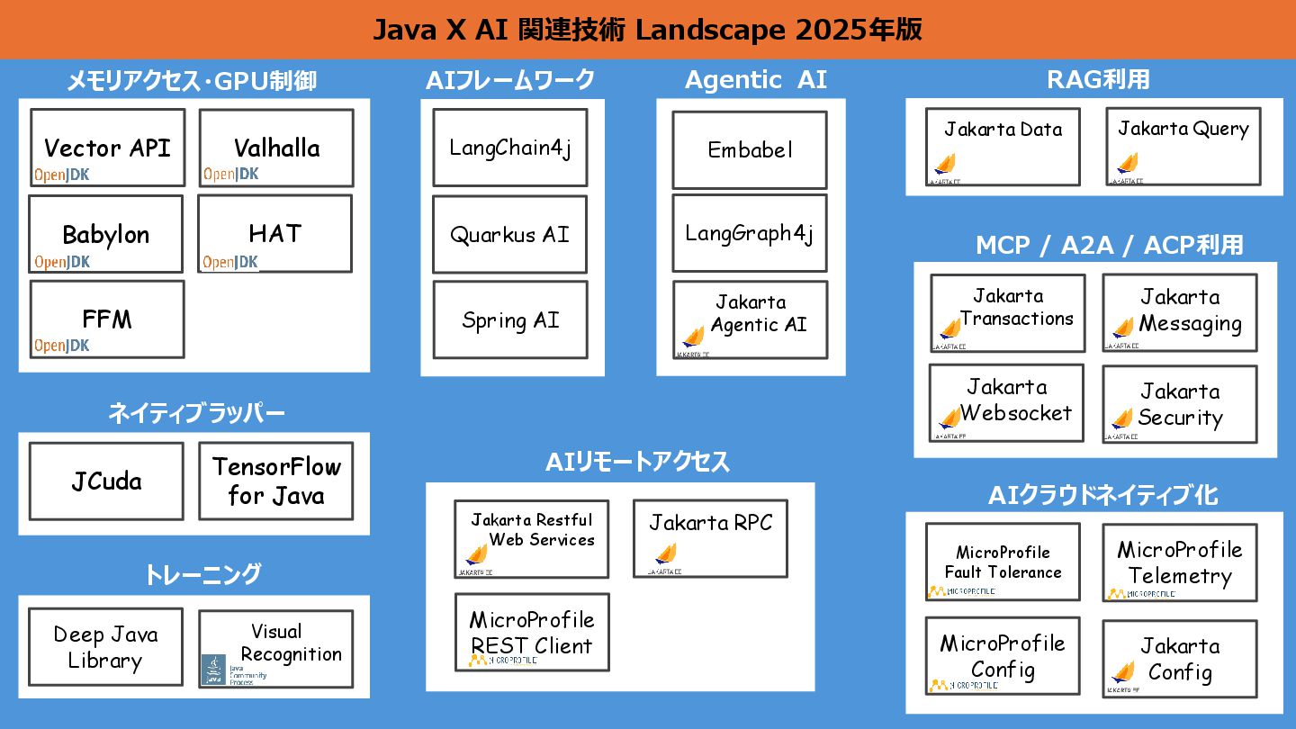 トレーニング MCP / A2A / ACP利用 AIクラウドネイティブ化 AIリモートアクセス Vector API HAT Babylon Valhalla JCuda TensorFlow for Java FFM Deep Java Library Visual Recognition Jakarta Agentic AI MicroProfile REST Client LangChain4j Jakarta Messaging Quarkus AI Spring AI LangGraph4j Embabel Jakarta Transactions Jakarta Query Jakarta Data Jakarta Security Jakarta Restful Web Services Jakarta RPC MicroProfile Fault Tolerance MicroProfile Telemetry MicroProfile Config Jakarta Websocket Jakarta Config Agentic AI