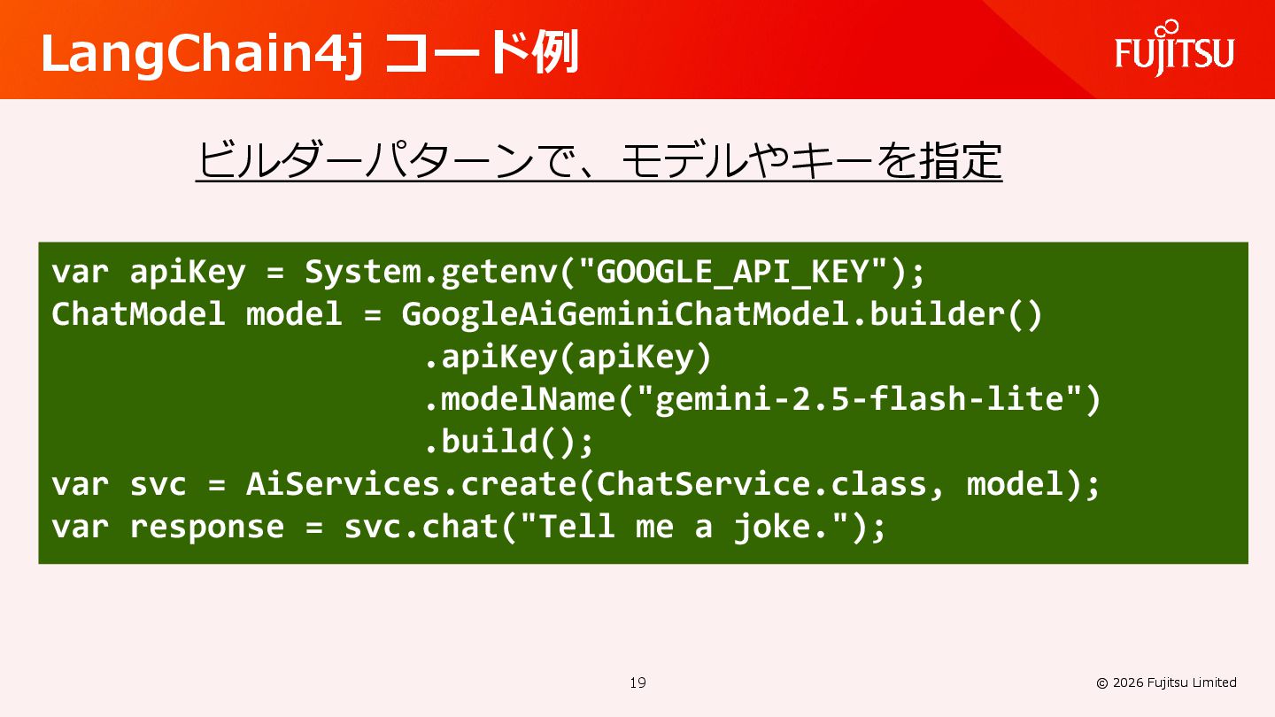 var apiKey = System.getenv("GOOGLE_API_KEY"); ChatModel model = GoogleAiGeminiChatModel.builder() .apiKey(apiKey) .modelName("gemini-2.5-flash-lite") .build(); var svc = AiServices.create(ChatService.class, model); var response = svc.chat("Tell me a joke."); ビルダーパターンで、モデルやキーを指定 19