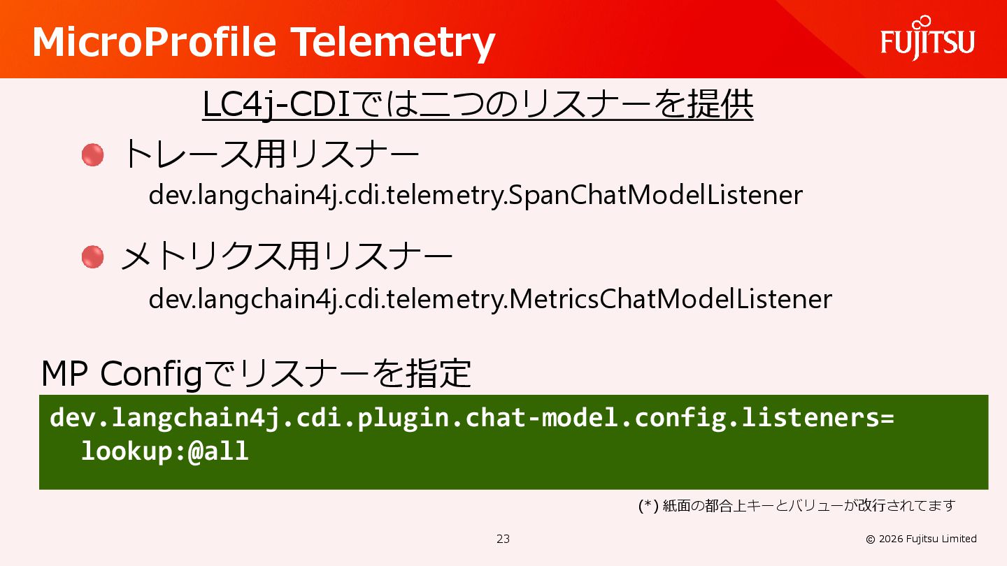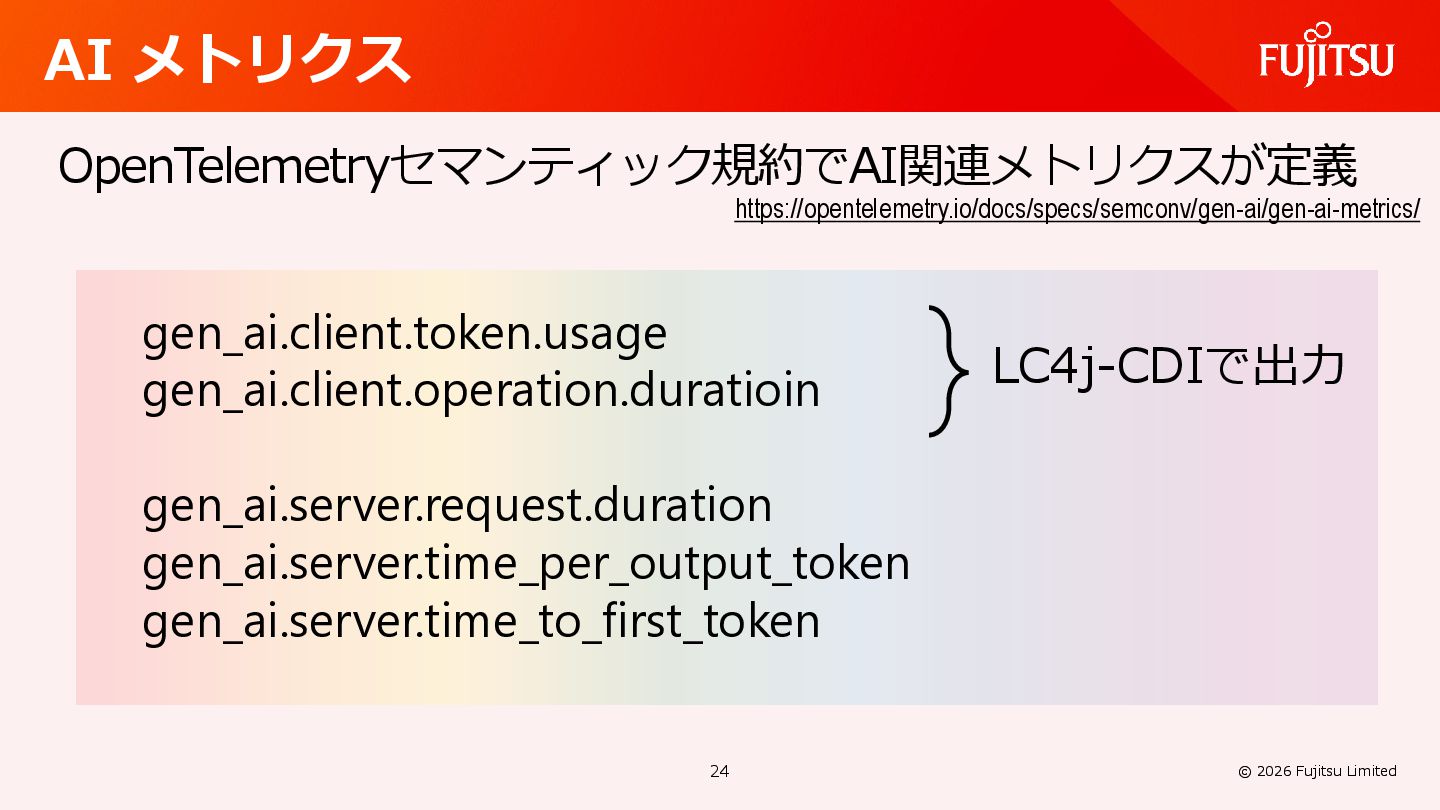 トレース用リスナー dev.langchain4j.cdi.telemetry.SpanChatModelListener メトリクス用リスナー dev.langchain4j.cdi.telemetry.MetricsChatModelListener LC4j-CDIでは二つのリスナーを提供 MP Configでリスナーを指定 dev.langchain4j.cdi.plugin.chat-model.config.listeners= lookup:@all (*) 紙面の都合上キーとバリューが改行されてます 23