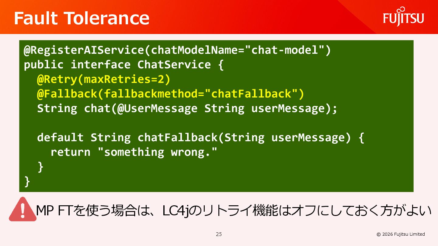 @RegisterAIService(chatModelName="chat-model") public interface ChatService { @Retry(maxRetries=2) @Fallback(fallbackmethod="chatFallback") String chat(@UserMessage String userMessage); default String chatFallback(String userMessage) { return "something wrong." } } MP FTを使う場合は、LC4jのリトライ機能はオフにしておく方がよい 25