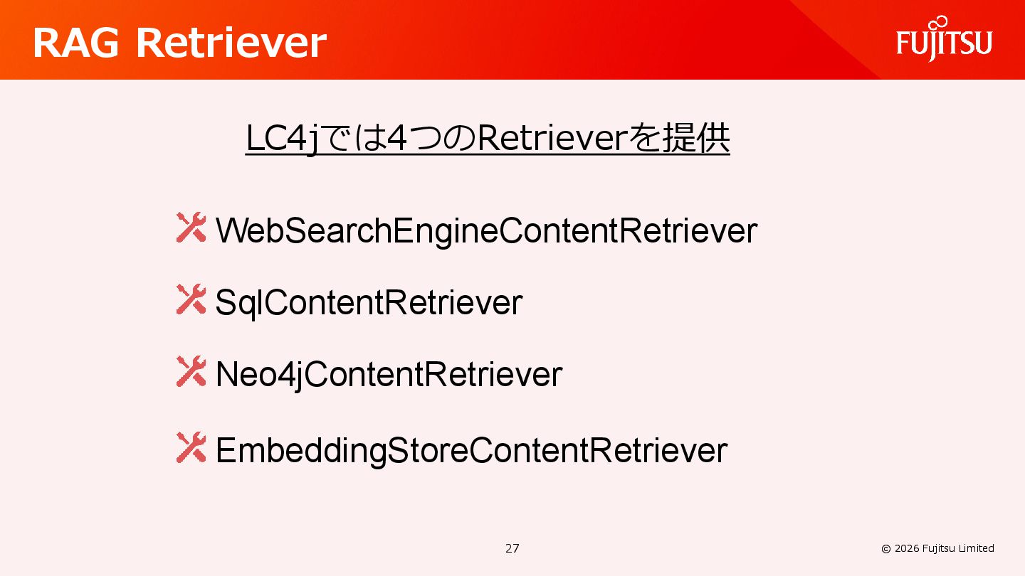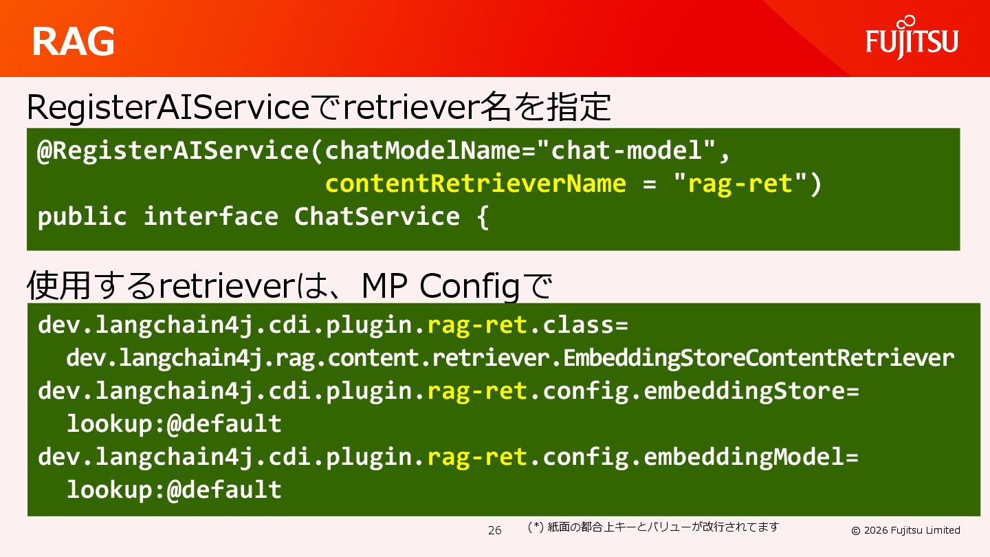 contentRetrieverName = "rag-ret") public interface ChatService { RegisterAIServiceでretriever名を指定 使用するretrieverは、MP Configで dev.langchain4j.cdi.plugin.rag-ret.class= dev.langchain4j.rag.content.retriever.EmbeddingStoreContentRetriever dev.langchain4j.cdi.plugin.rag-ret.config.embeddingStore= lookup:@default dev.langchain4j.cdi.plugin.rag-ret.config.embeddingModel= lookup:@default (*) 紙面の都合上キーとバリューが改行されてます 26