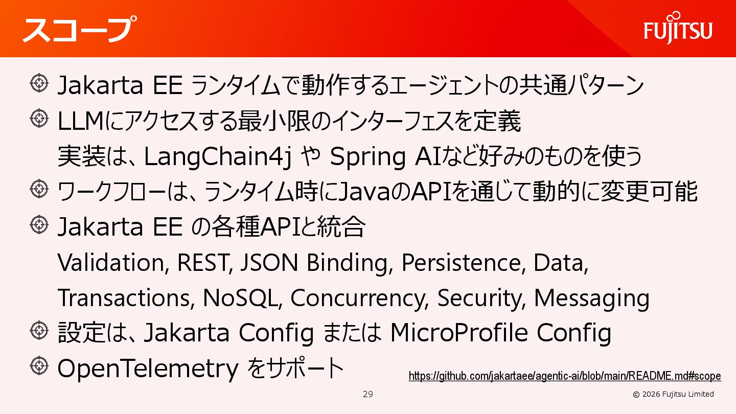 EE ランタイムで動作するエージェントの共通パターン LLMにアクセスする最小限のインターフェスを定義 実装は、LangChain4j や Spring AIなど好みのものを使う ワークフローは、ランタイム時にJavaのAPIを通じて動的に変更可能 Jakarta EE の各種APIと統合 Validation, REST, JSON Binding, Persistence, Data, Transactions, NoSQL, Concurrency, Security, Messaging 設定は、Jakarta Config または MicroProfile Config OpenTelemetry をサポート https://github.com/jakartaee/agentic-ai/blob/main/README.md#scope 29