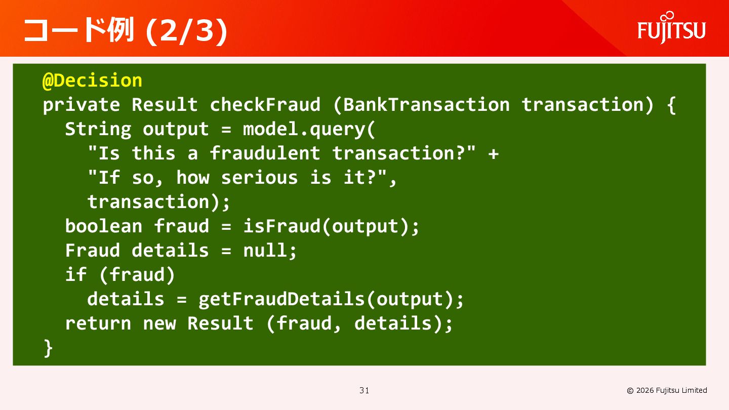 @Decision private Result checkFraud (BankTransaction transaction) { String output = model.query( "Is this a fraudulent transaction?" + "If so, how serious is it?", transaction); boolean fraud = isFraud(output); Fraud details = null; if (fraud) details = getFraudDetails(output); return new Result (fraud, details); } 31
