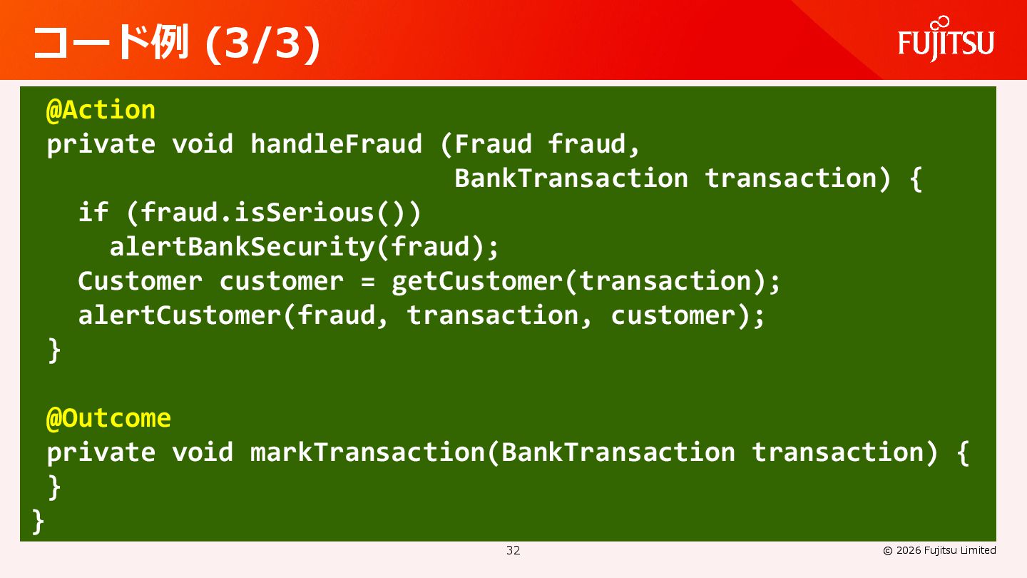 @Action private void handleFraud (Fraud fraud, BankTransaction transaction) { if (fraud.isSerious()) alertBankSecurity(fraud); Customer customer = getCustomer(transaction); alertCustomer(fraud, transaction, customer); } @Outcome private void markTransaction(BankTransaction transaction) { } } 32