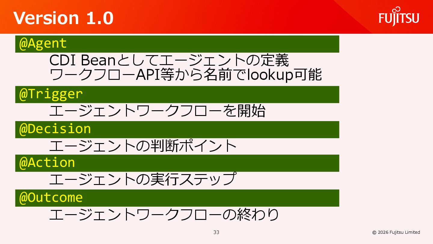 @Agent CDI Beanとしてエージェントの定義 ワークフローAPI等から名前でlookup可能 @Trigger エージェントワークフローを開始 @Decision エージェントの判断ポイント @Action エージェントの実行ステップ @Outcome エージェントワークフローの終わり 33