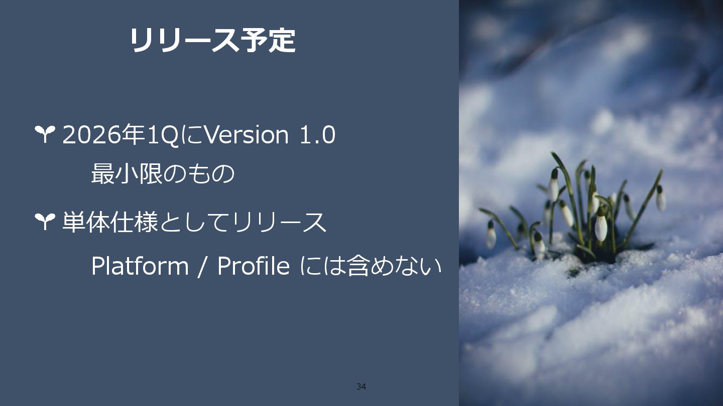 1.0 最小限のもの 単体仕様としてリリース Platform / Profile には含めない 34