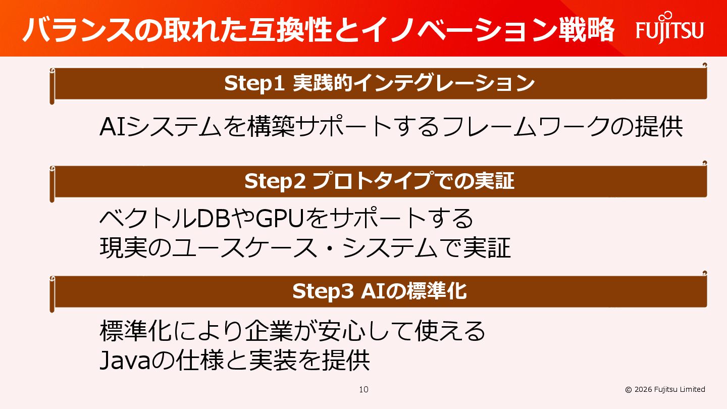 ベクトルDBやGPUをサポートする 現実のユースケース・システムで実証 標準化により企業が安心して使える Javaの仕様と実装を提供 Step1 実践的インテグレーション Step2 プロトタイプでの実証 Step3 AIの標準化 10
