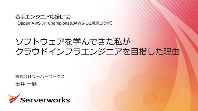 ソフトウェアを学んできた私が クラウドインフラエンジニアを目指した理由 若手エンジニア応援LT会 (Japan AWS Jr. Champions&JAWS-UG東京コラボ) 圡井 一磨 株式会社サーバーワークス