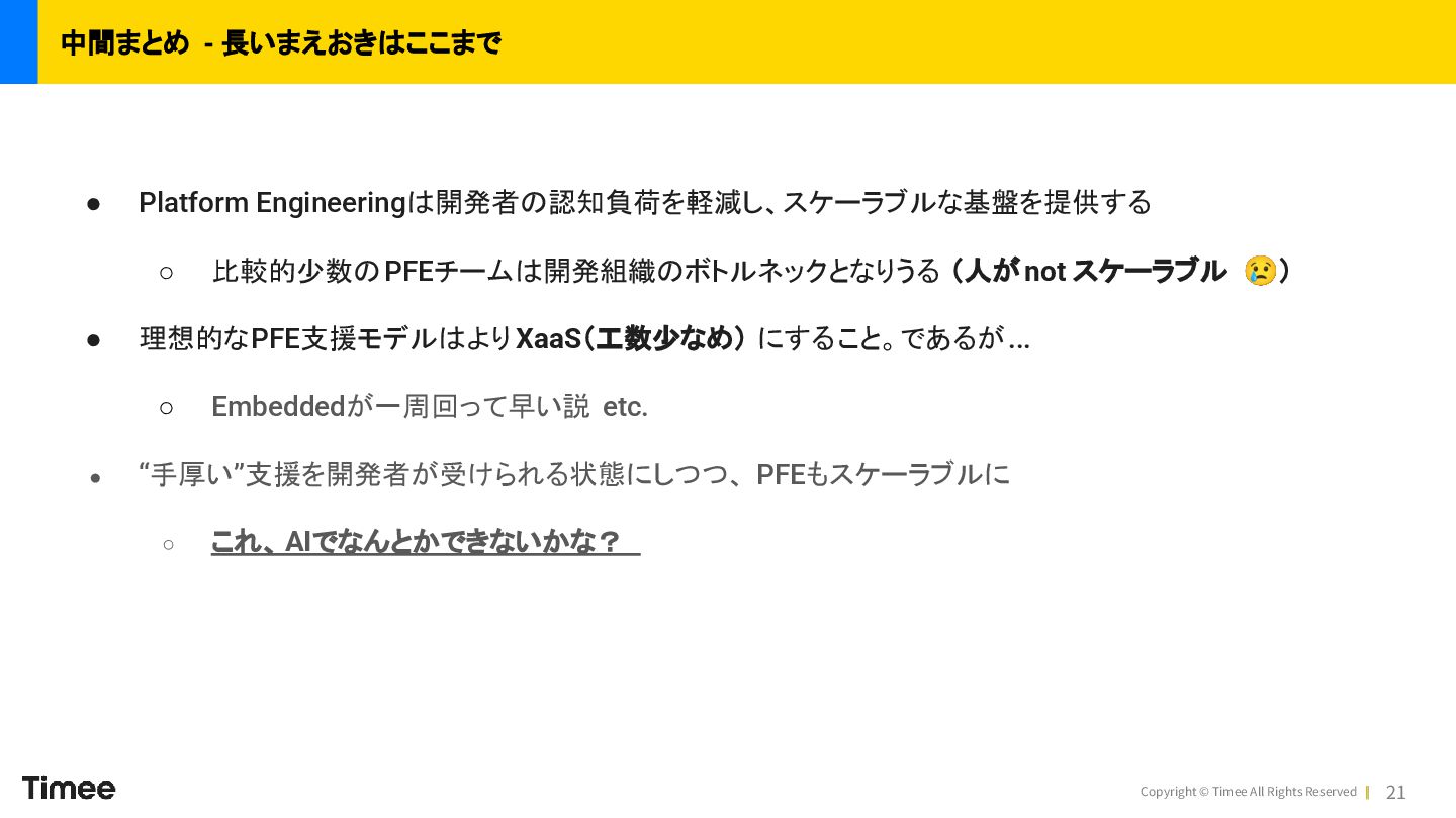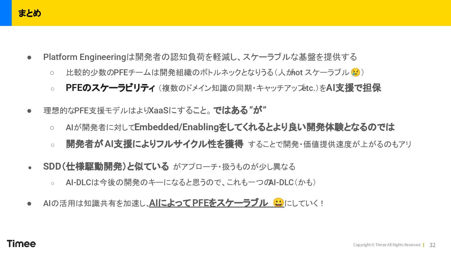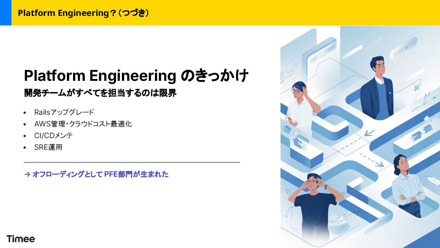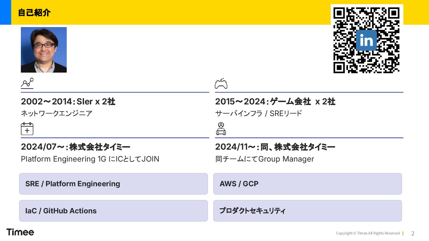 成長フェーズごとに変化するインフラを、SREやPlatformEngineering視点でどう支えるか。開発者に対して横断的な支援をする場合、手厚い支援(Enbedded)・能力獲得支援(Enabling)・ツール化(XaaS)など様々なアプローチがあります。スケーラビリティを担保するにはEnabling/XaaS化が理想ですが難しくもあります。AIの進化を味方につけ、開発者が自律的に動ける土台を整え、組織全体のスケールを支援する──現在取り組んでいる実践と試行錯誤の中身をお話しします。