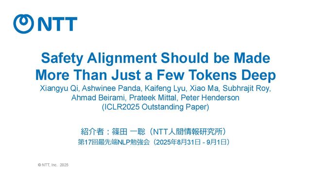 Than Just a Few Tokens Deep 紹介者:篠田 一聡(NTT人間情報研究所) 第17回最先端NLP勉強会(2025年8月31日 - 9月1日) Xiangyu Qi, Ashwinee Panda, Kaifeng Lyu, Xiao Ma, Subhrajit Roy, Ahmad Beirami, Prateek Mittal, Peter Henderson (ICLR2025 Outstanding Paper)