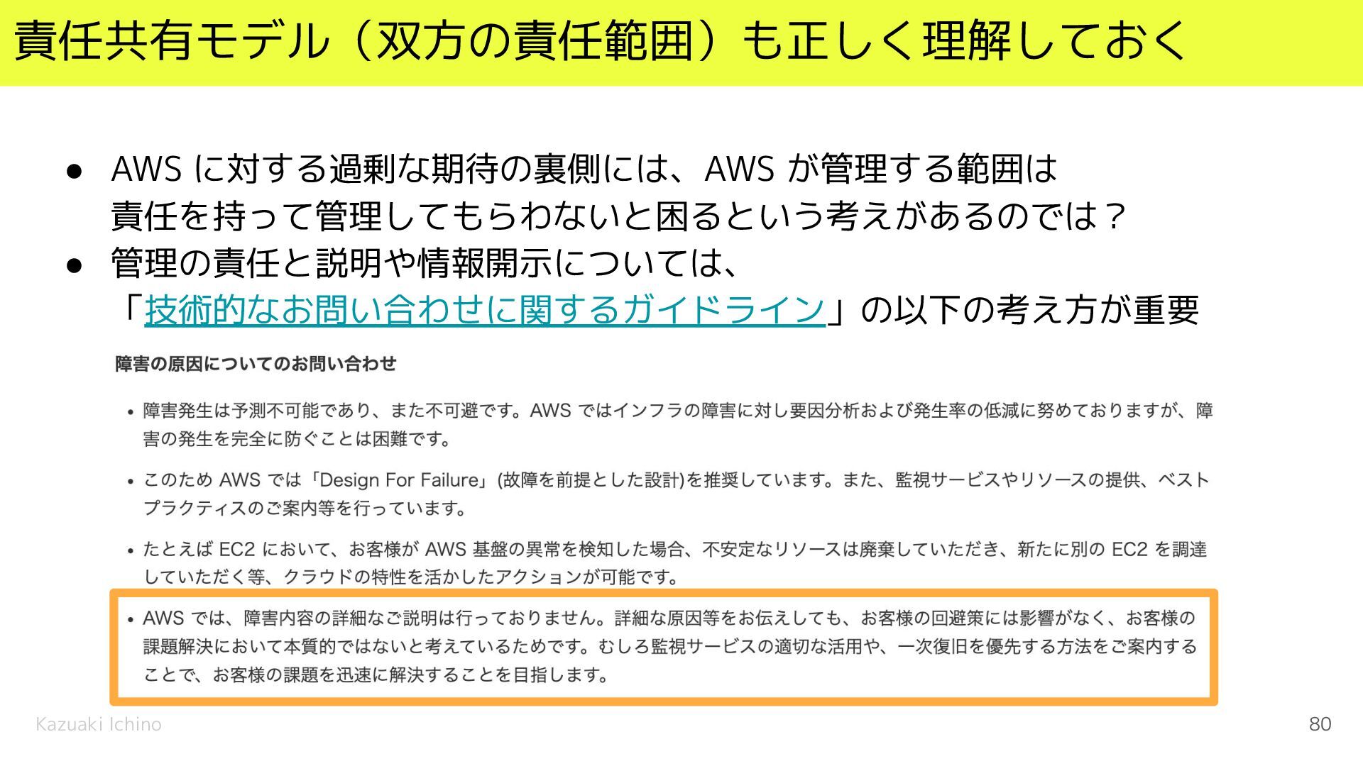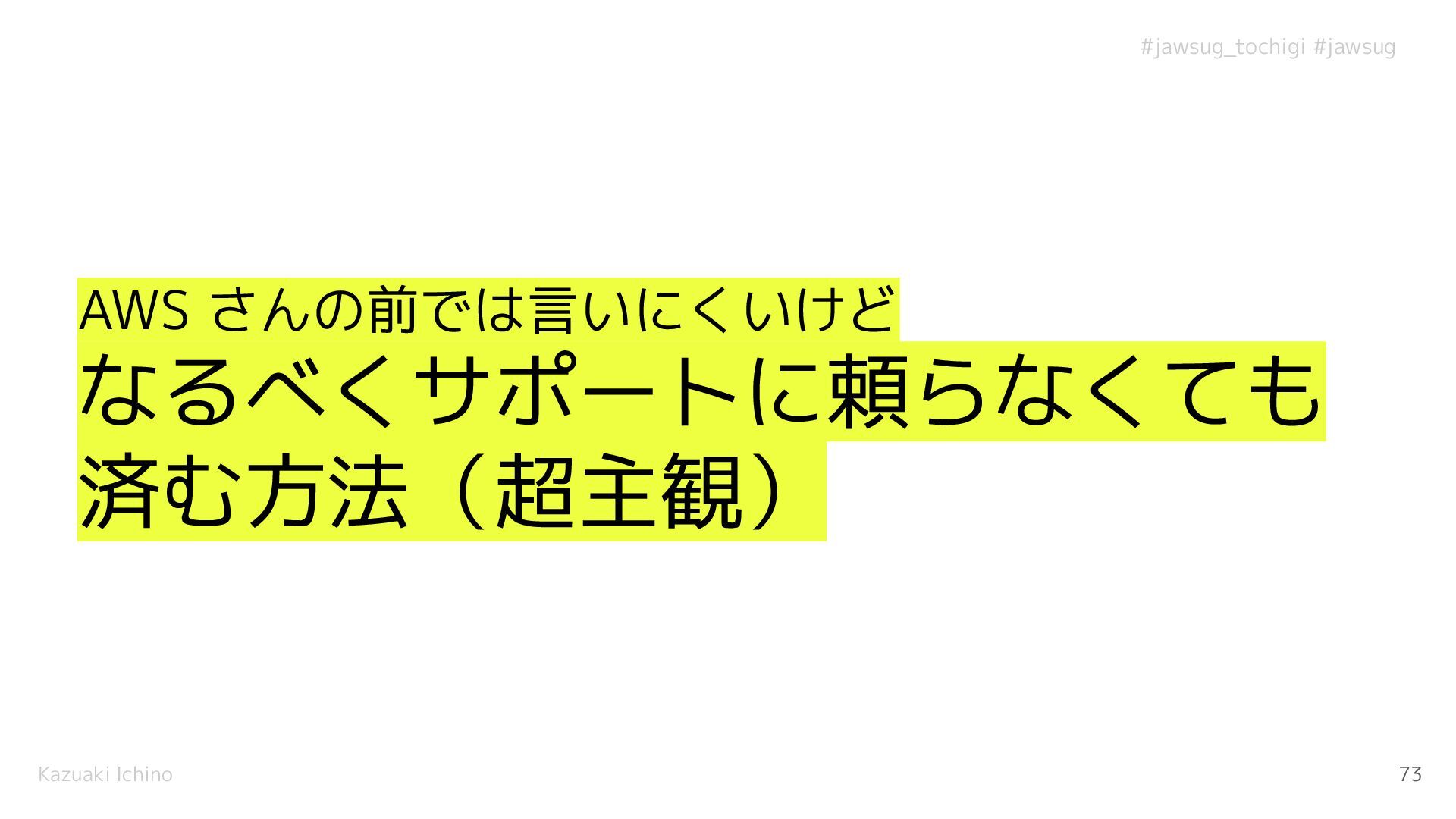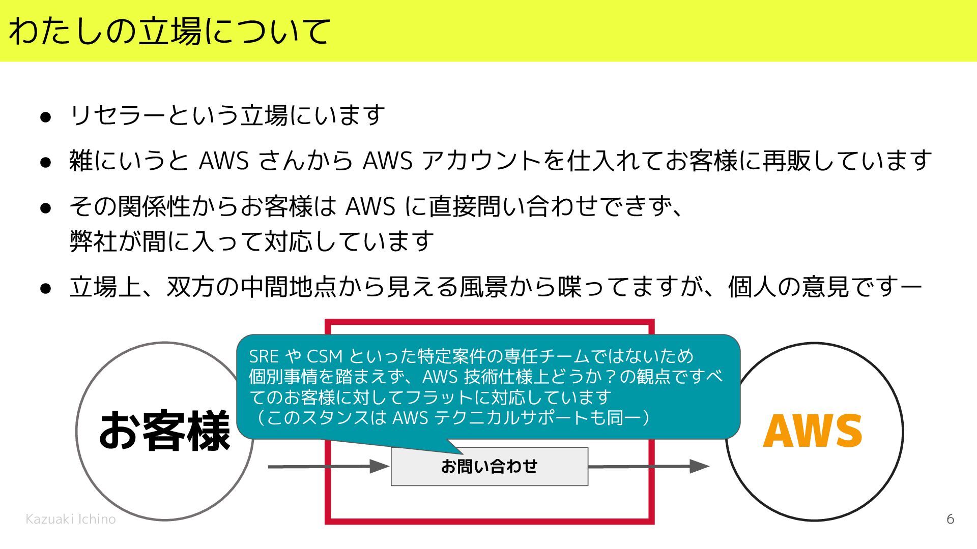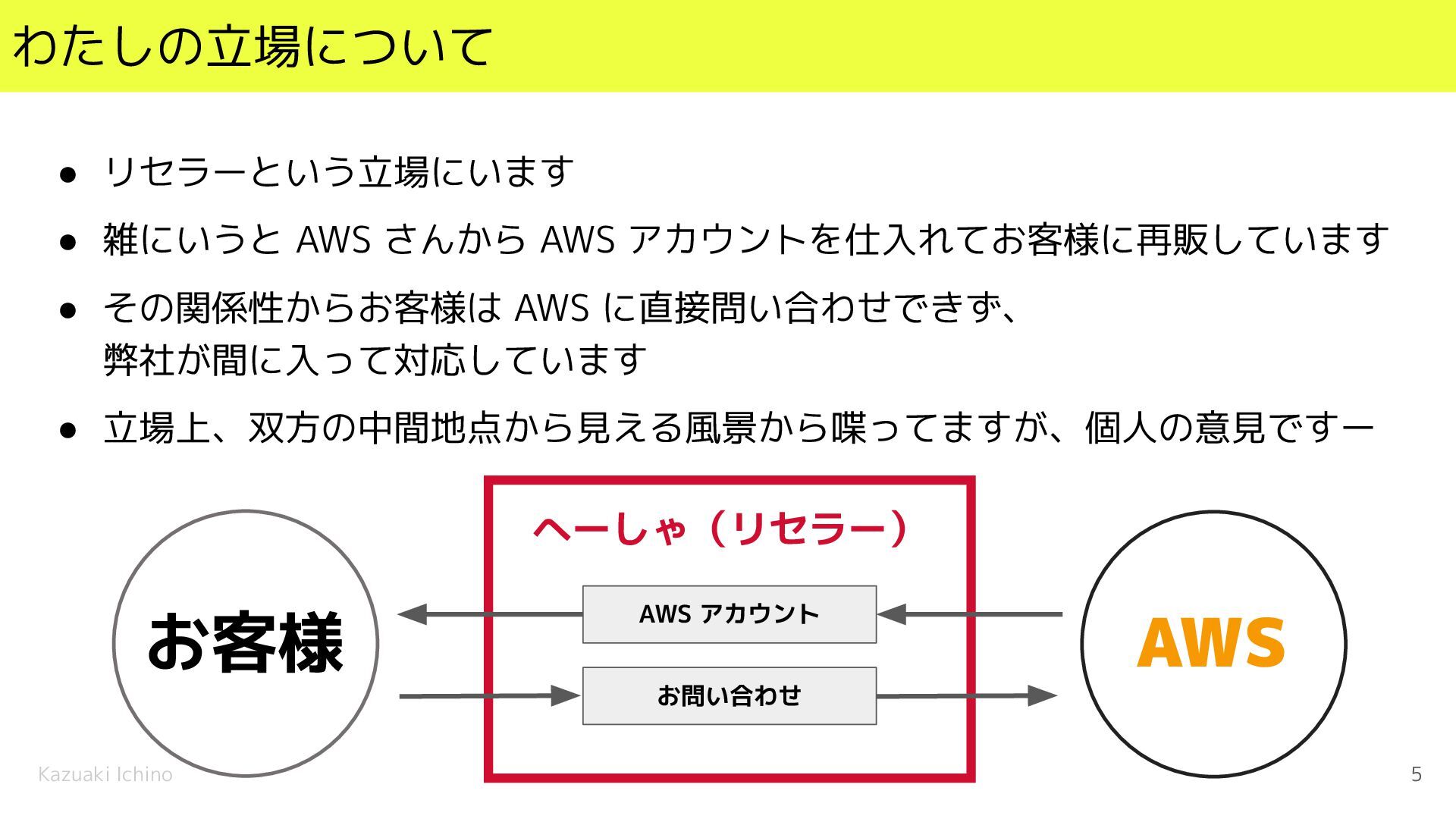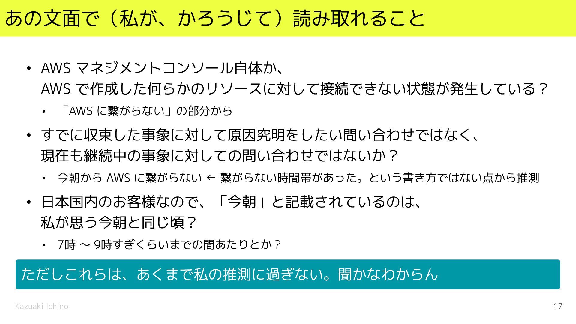 昨年の JAWSUG 北陸新幹線や JAWS FESTA 広島の時の私の話を聞いてくださったことのある方には耳タコかもなのですが、リセラーのテクニカルサポート部門でお客様と AWS テクニカルサポートの中間地点で業務をしていて思うことや、4月に発生した東京リージョンの AZ 障害の際のことをお話ししました。