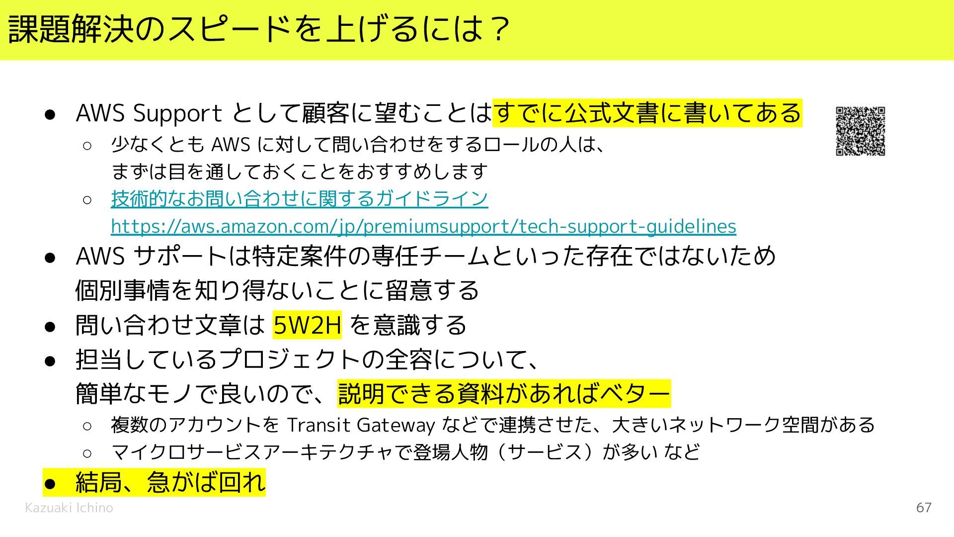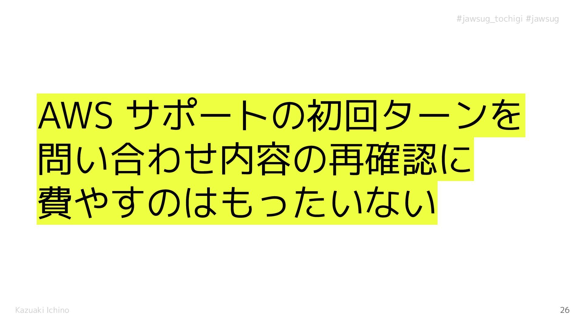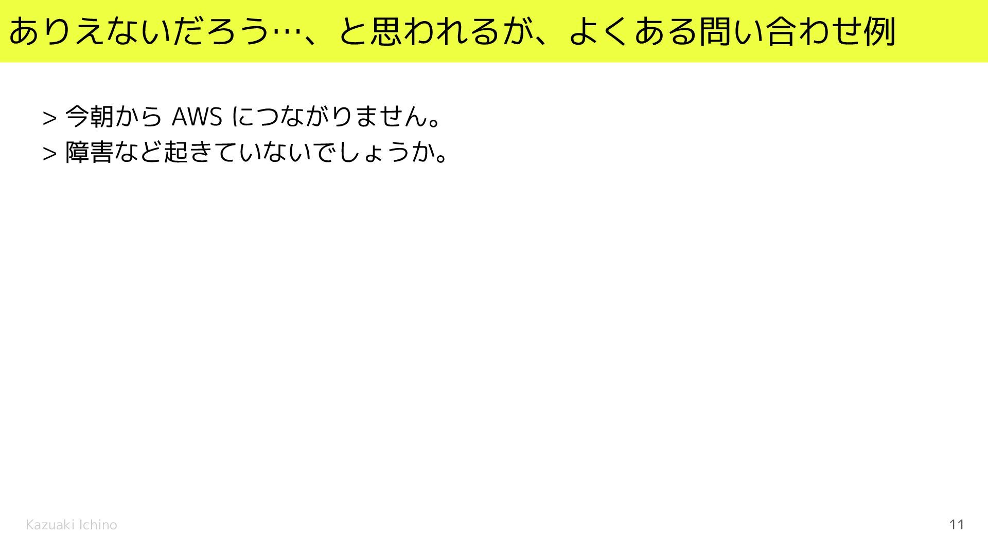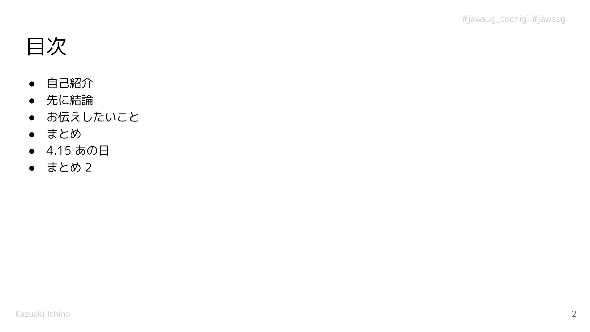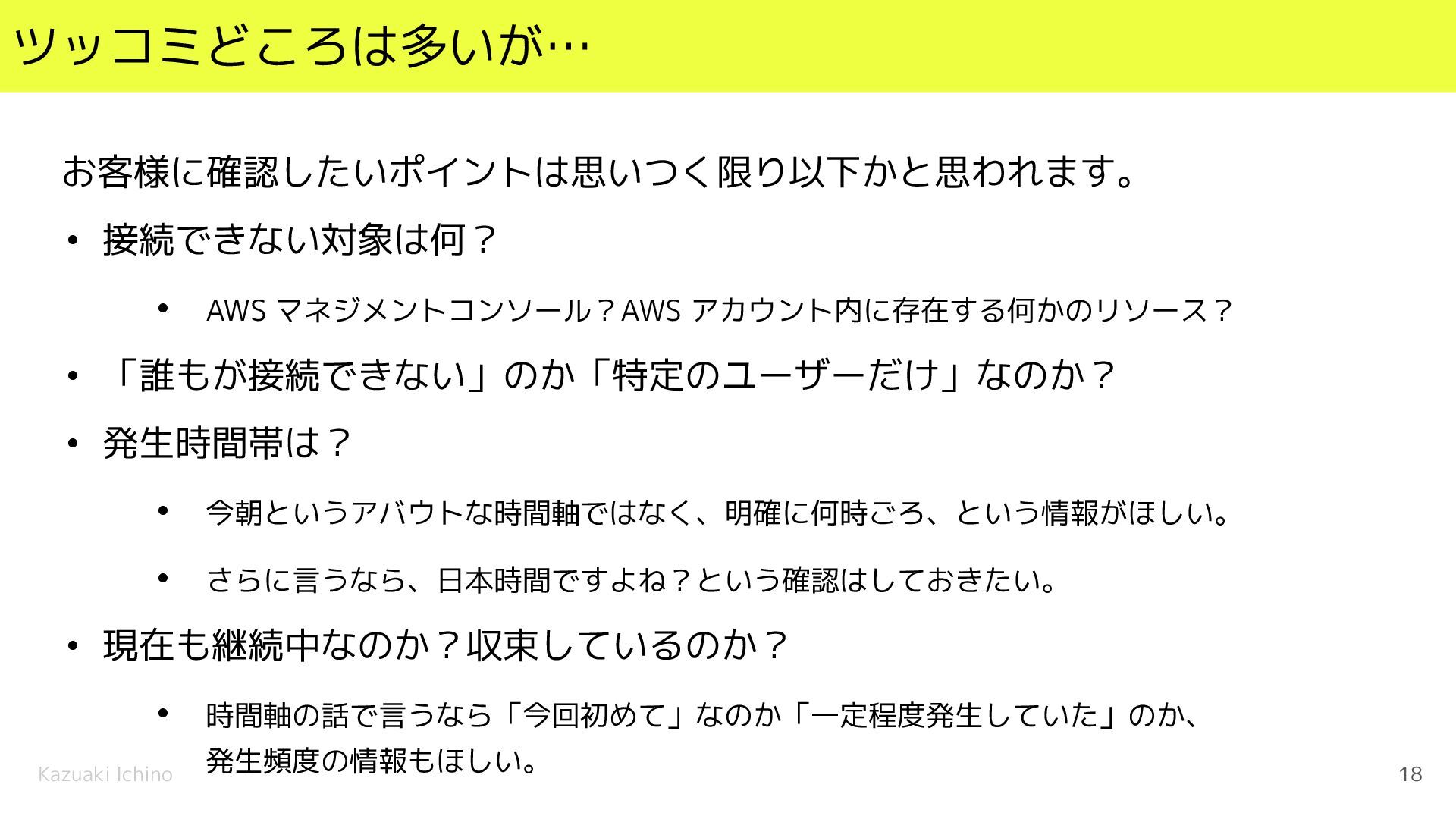昨年の JAWSUG 北陸新幹線や JAWS FESTA 広島の時の私の話を聞いてくださったことのある方には耳タコかもなのですが、リセラーのテクニカルサポート部門でお客様と AWS テクニカルサポートの中間地点で業務をしていて思うことや、4月に発生した東京リージョンの AZ 障害の際のことをお話ししました。