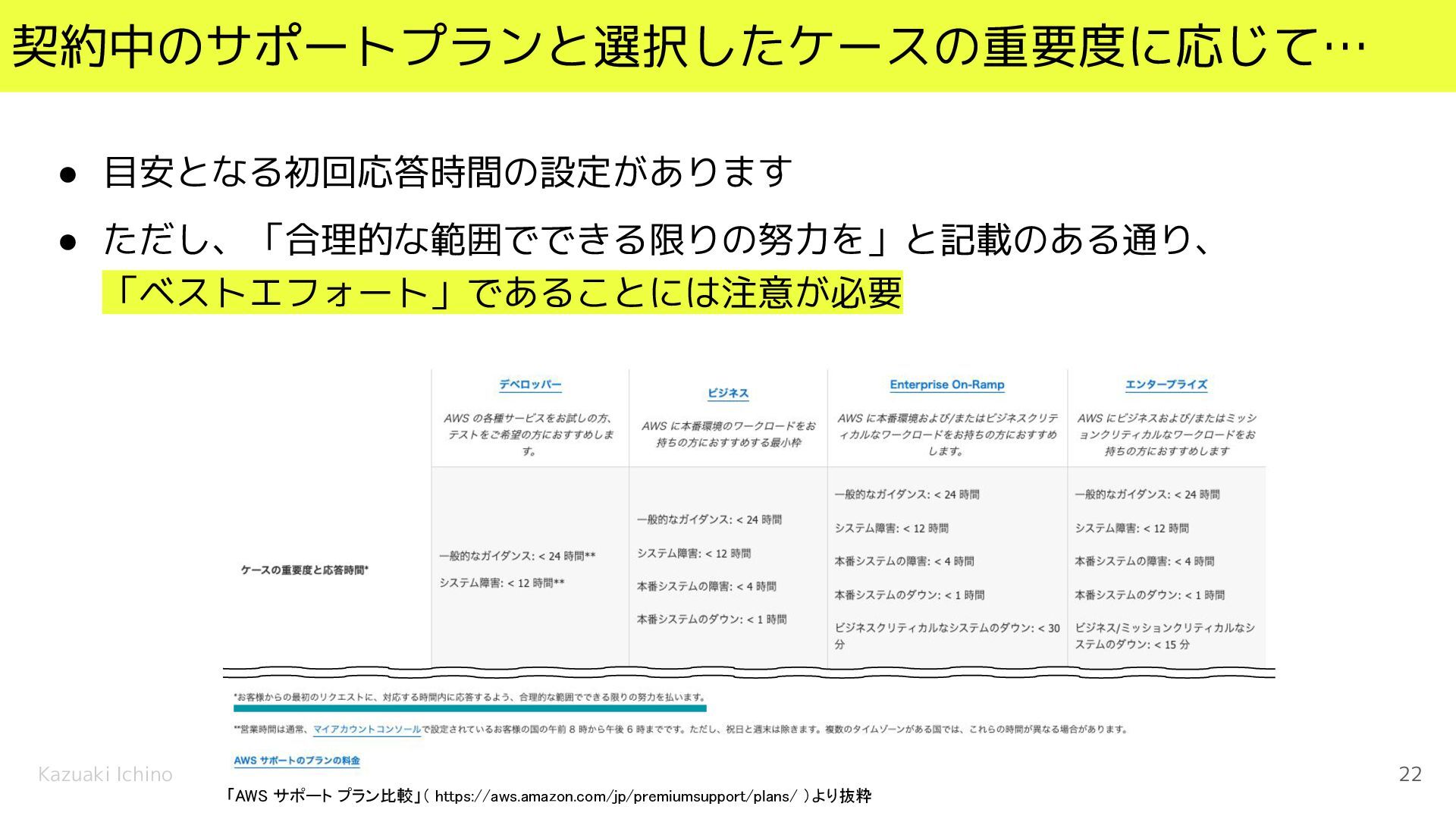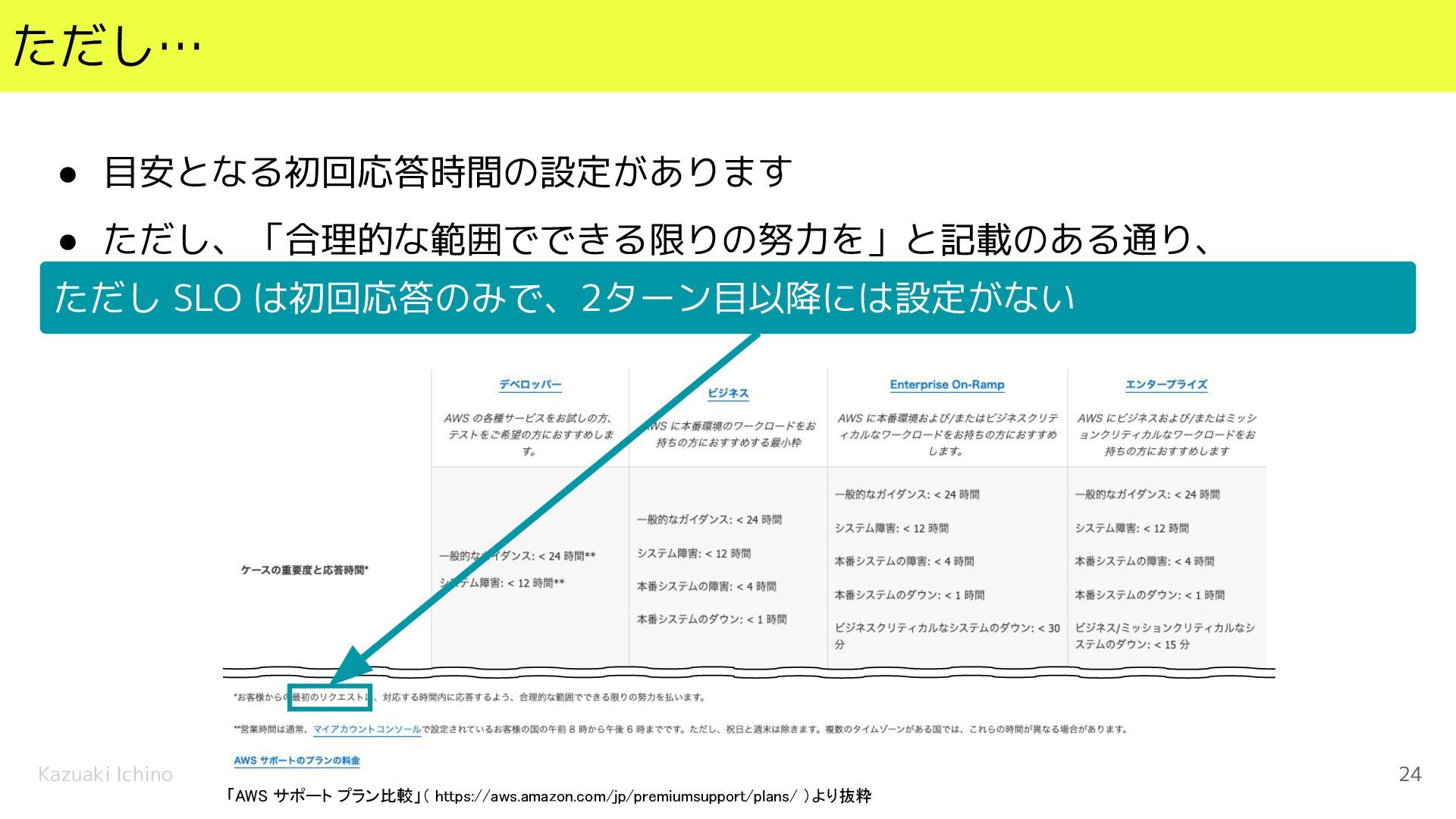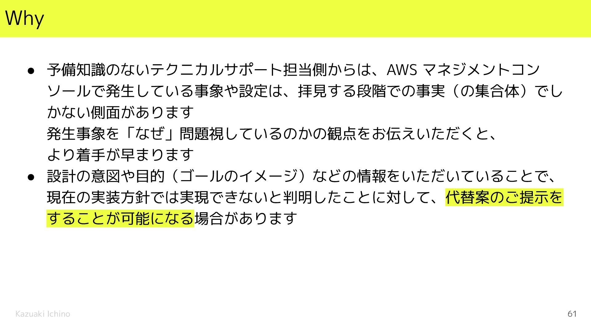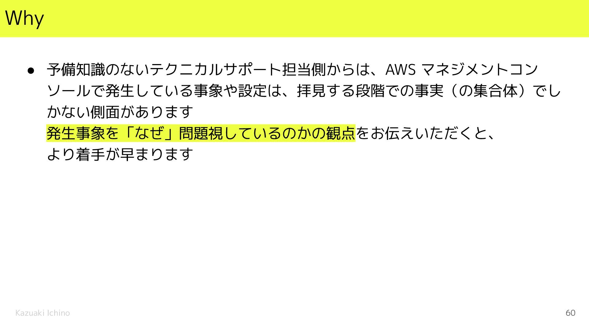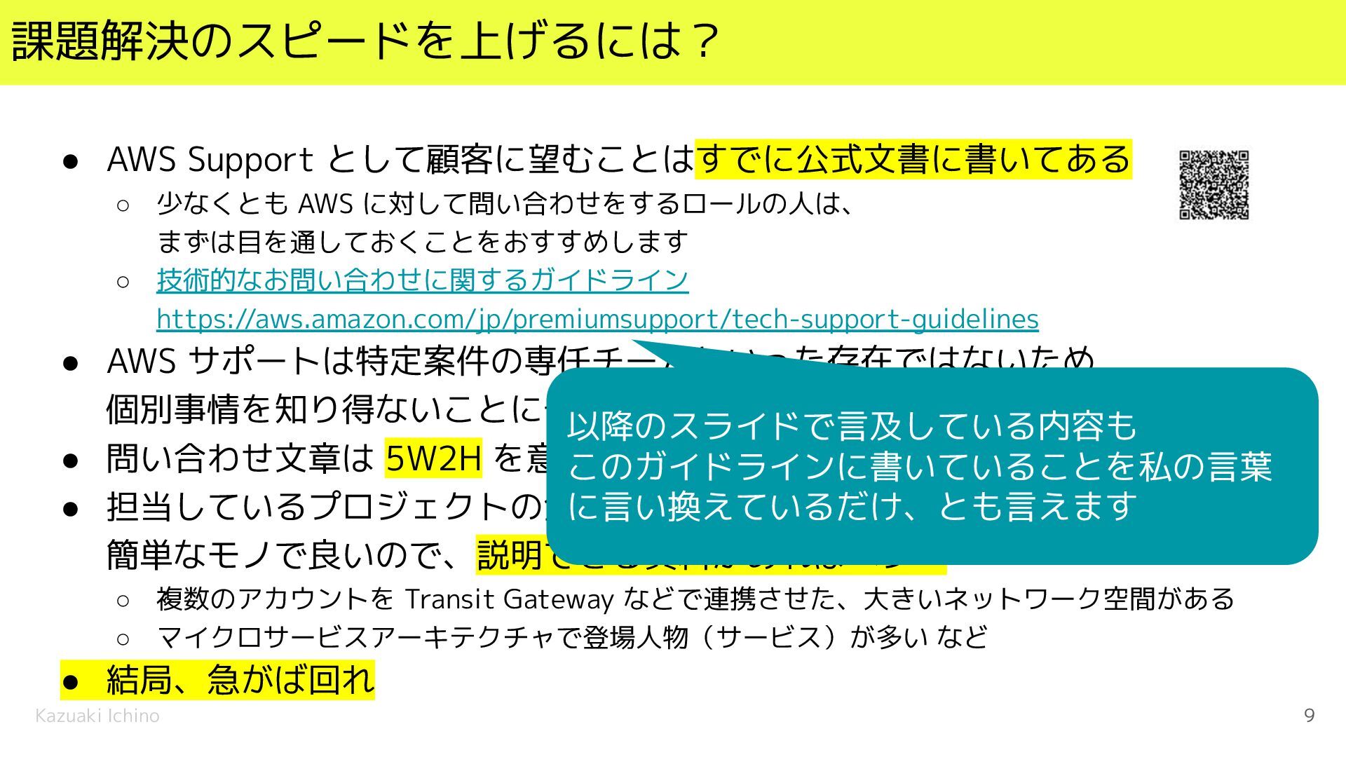 昨年の JAWSUG 北陸新幹線や JAWS FESTA 広島の時の私の話を聞いてくださったことのある方には耳タコかもなのですが、リセラーのテクニカルサポート部門でお客様と AWS テクニカルサポートの中間地点で業務をしていて思うことや、4月に発生した東京リージョンの AZ 障害の際のことをお話ししました。