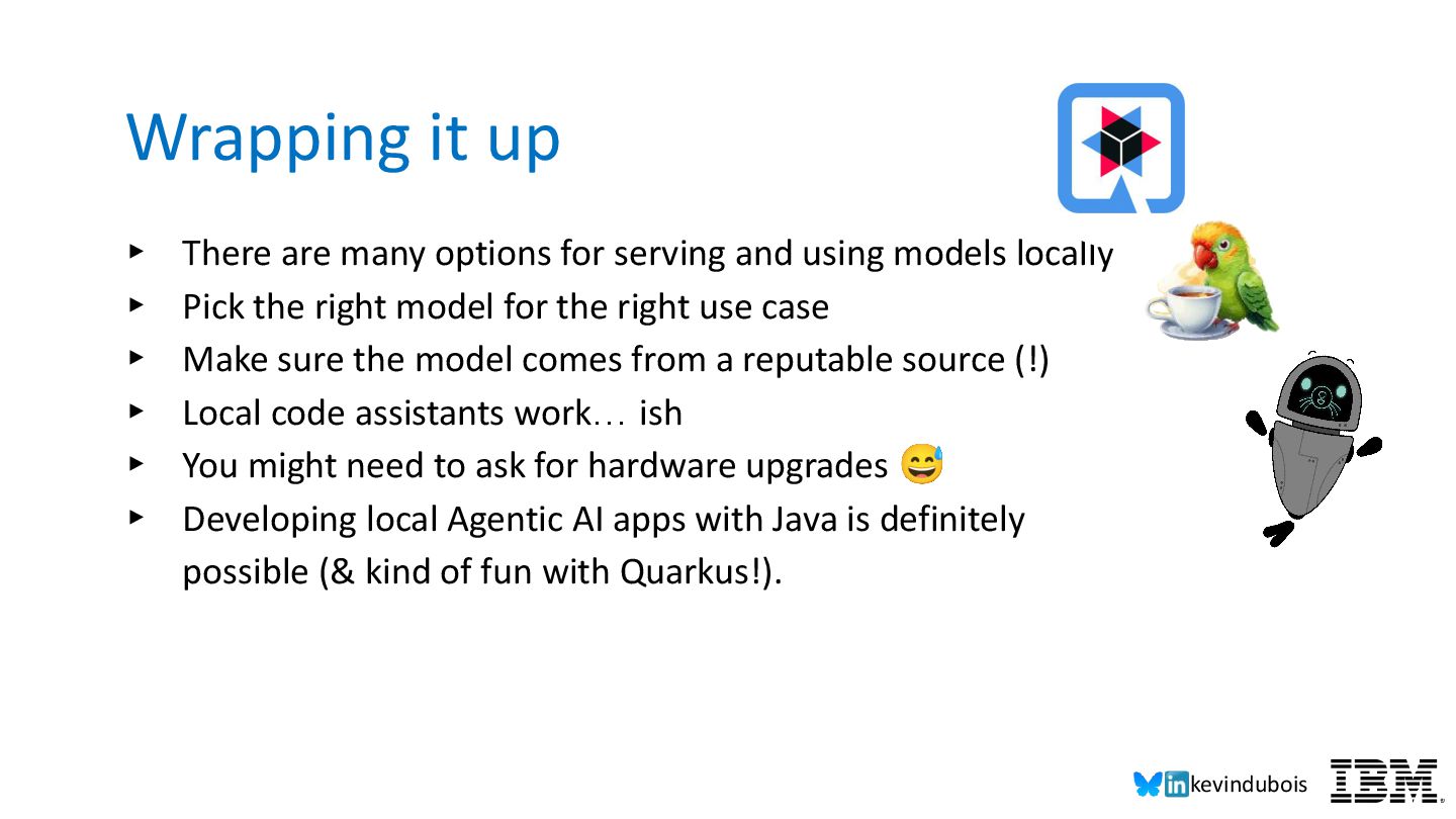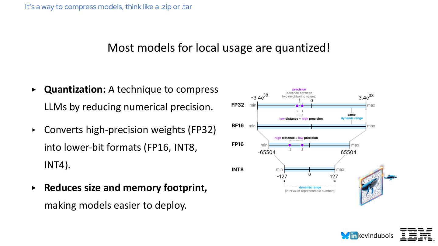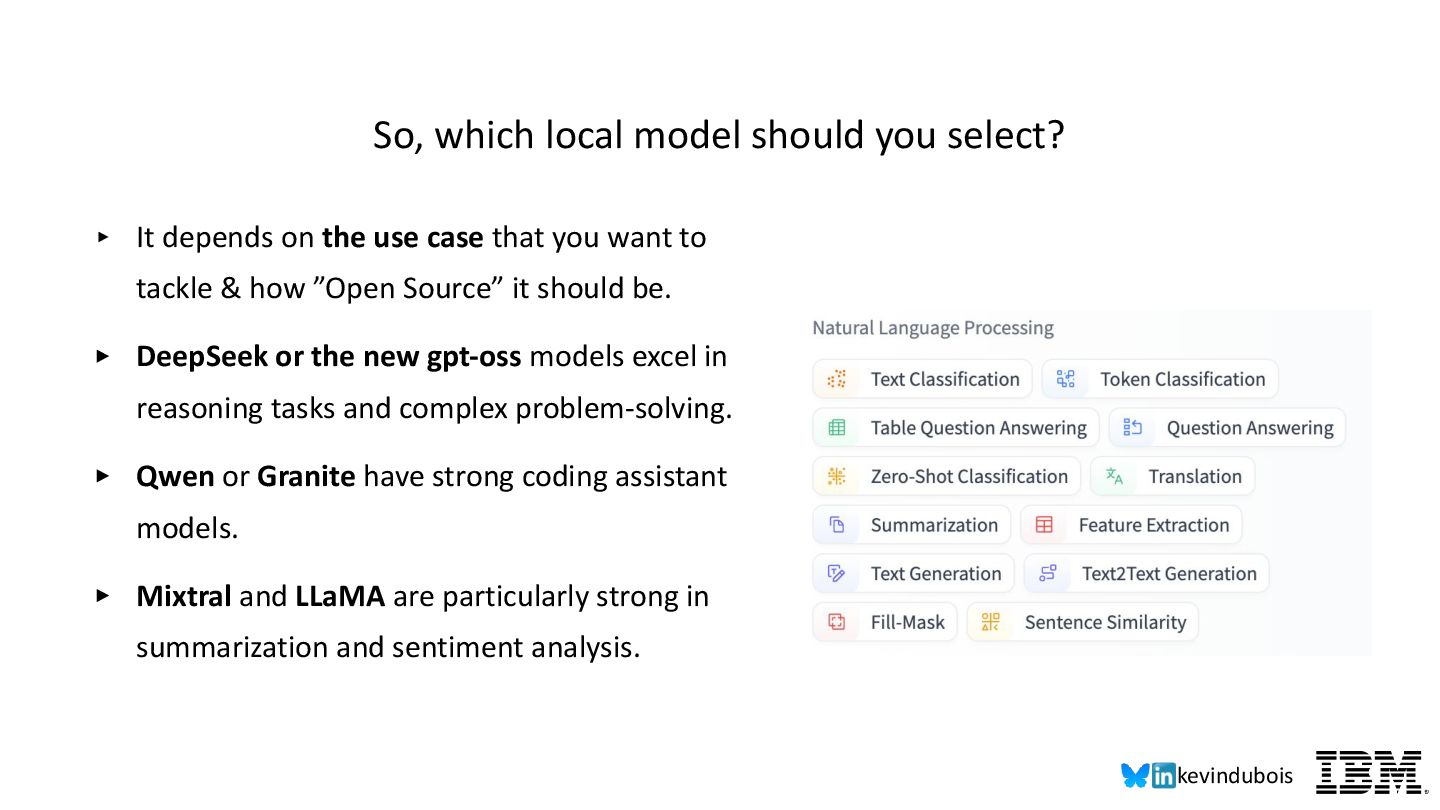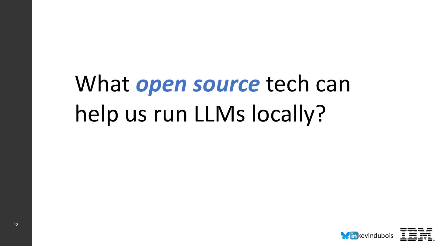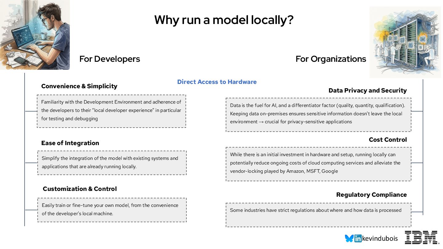 the Development Environment and adherence of the developers to their “local developer experience” in particular for testing and debugging Convenience & Simplicity Direct Access to Hardware Ease of Integration Simplify the integration of the model with existing systems and applications that are already running locally. For Organizations Data Privacy and Security Data is the fuel for AI, and a differentiator factor (quality, quantity, qualification). Keeping data on-premises ensures sensitive information doesn’t leave the local environment → crucial for privacy-sensitive applications Cost Control While there is an initial investment in hardware and setup, running locally can potentially reduce ongoing costs of cloud computing services and alleviate the vendor-locking played by Amazon, MSFT, Google Regulatory Compliance Some industries have strict regulations about where and how data is processed Customization & Control Easily train or fine-tune your own model, from the convenience of the developer’s local machine.