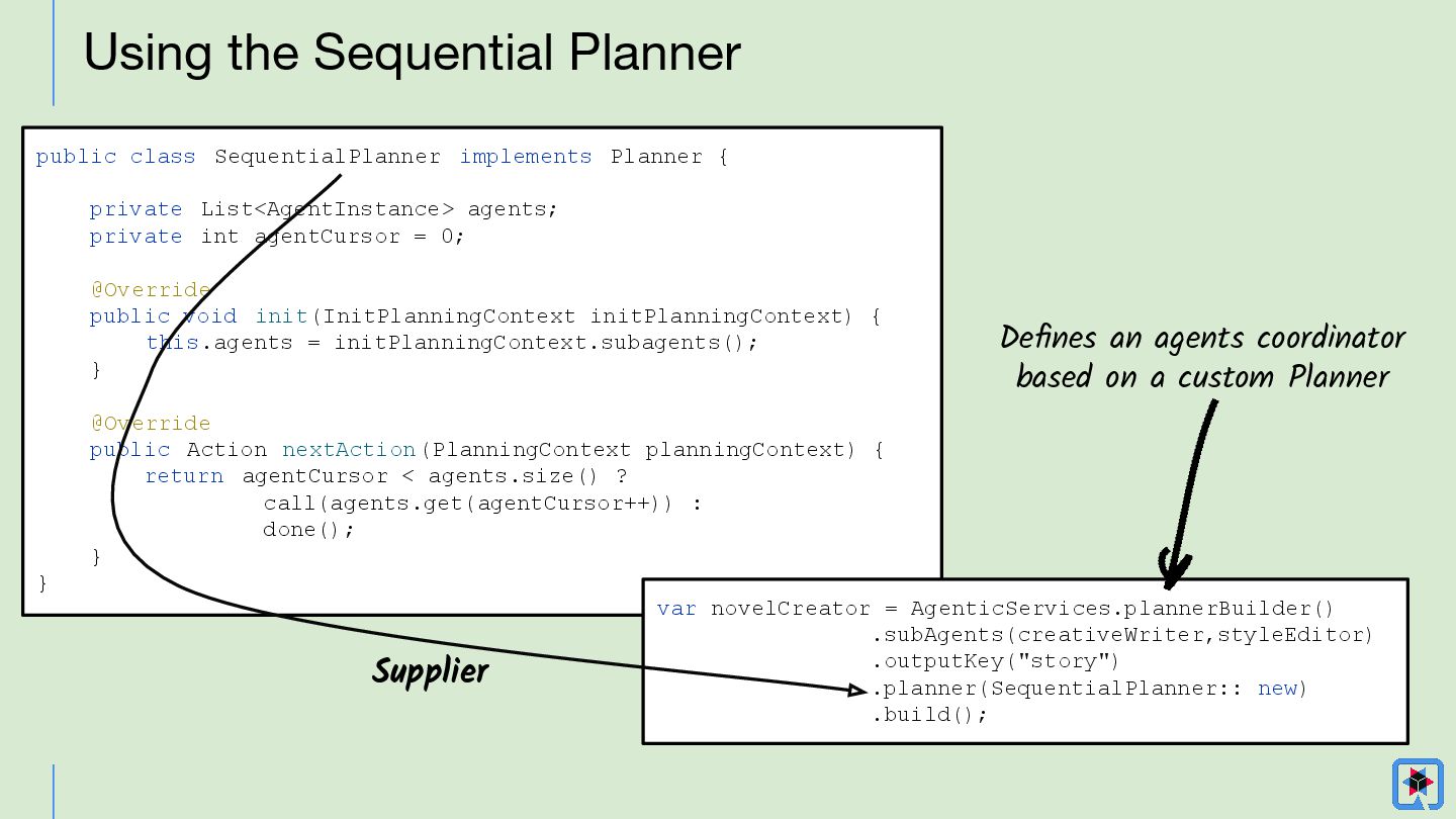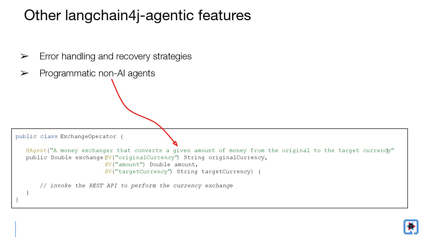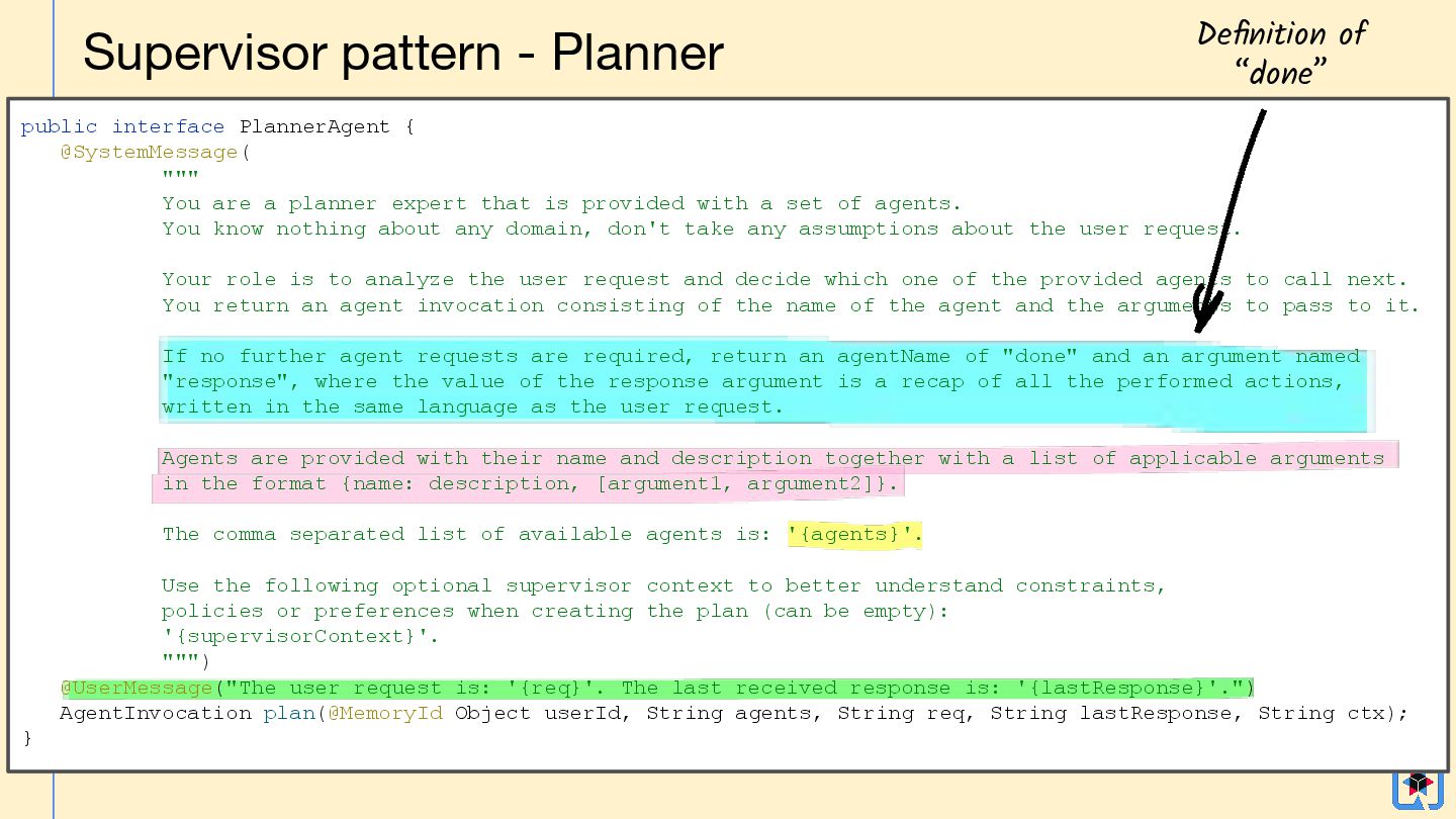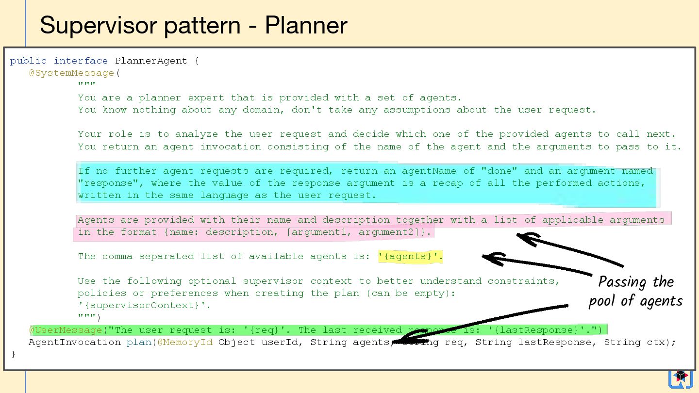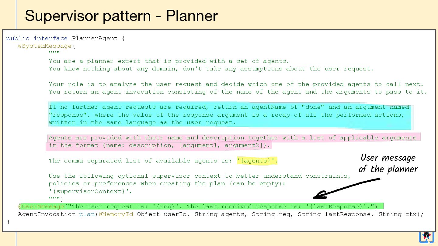 @SystemMessage( """ … """) @UserMessage("The user request is: '{req}'. The last received response is: '{lastResponse}'.") AgentInvocation plan(@MemoryId Object userId, String agents, String req, String lastResponse, String ctx); } AgentInvocation{agentName='exchange', arguments={originalCurrency=EUR, amount=100, targetCurrency=USD}} AgentInvocation{agentName='credit', arguments={creditUser=Kevin, amountInUSD=115.0}} AgentInvocation{agentName='withdraw', arguments={withdrawUser=Mario, amountInUSD=115.0}} AgentInvocation{agentName='done', arguments={response=100 EUR has been transferred from Mario's account to Kevin's account. Kevin's account has been credited with 115.0 USD, and the new balance is 1115.0 USD. The withdrawal of 115.0 USD from Mario's account has been completed, and the new balance is 885.0 USD.}