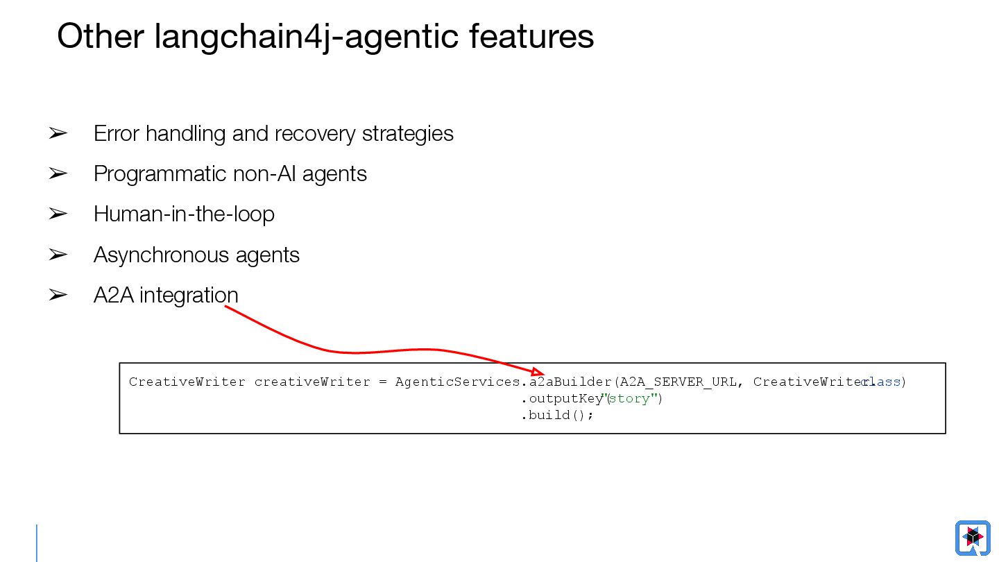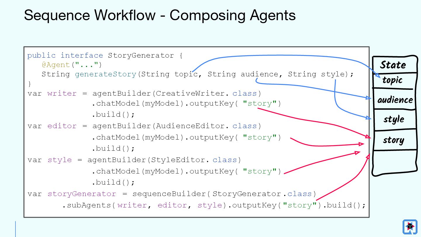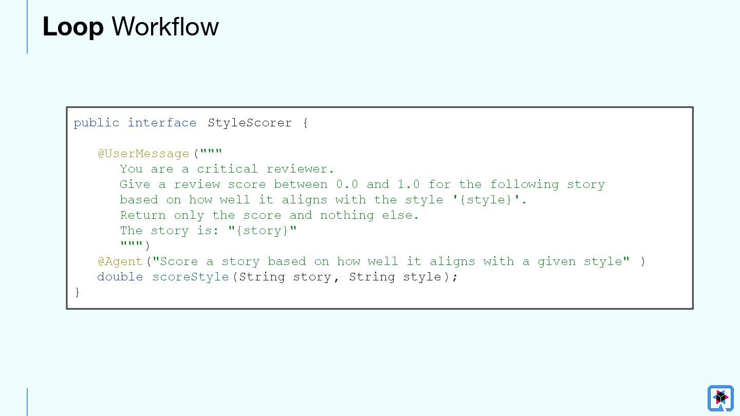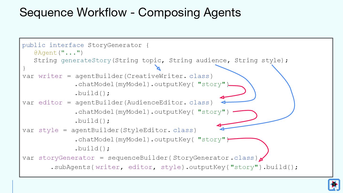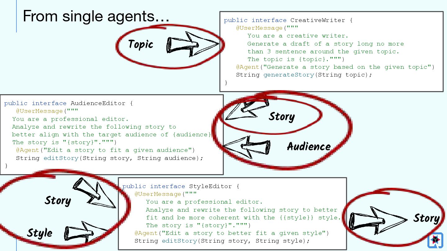 @SystemMessage( """ … """) @UserMessage("The user request is: '{req}'. The last received response is: '{lastResponse}'.") AgentInvocation plan(@MemoryId Object userId, String agents, String req, String lastResponse, String ctx); } AgentInvocation{agentName='exchange', arguments={originalCurrency=EUR, amount=100, targetCurrency=USD}} AgentInvocation{agentName='credit', arguments={creditUser=Kevin, amountInUSD=115.0}} AgentInvocation{agentName='withdraw', arguments={withdrawUser=Mario, amountInUSD=115.0}} AgentInvocation{agentName='done', arguments={response=100 EUR has been transferred from Mario's account to Kevin's account. Kevin's account has been credited with 115.0 USD, and the new balance is 1115.0 USD. The withdrawal of 115.0 USD from Mario's account has been completed, and the new balance is 885.0 USD.}