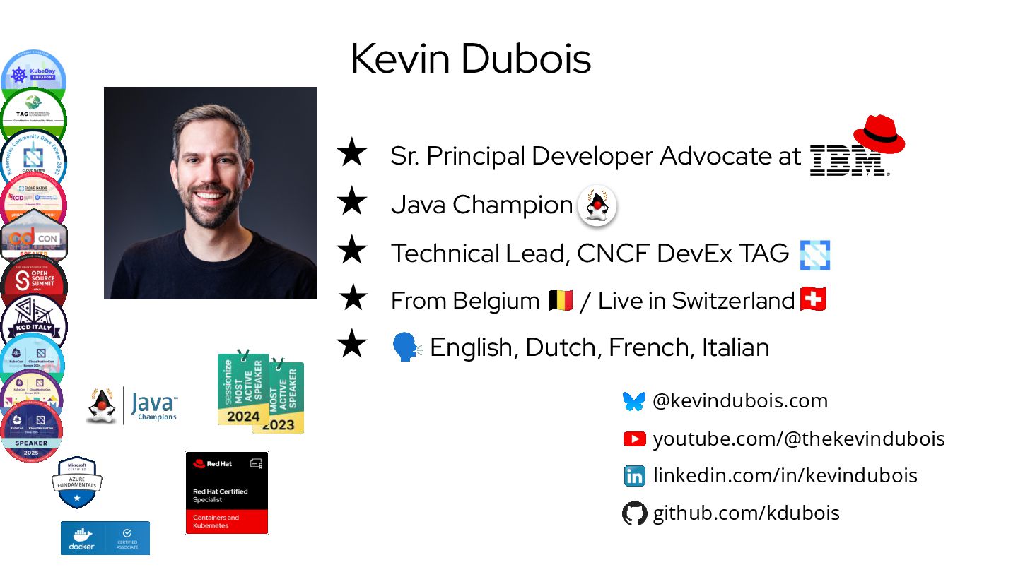 Champion ★ Technical Lead, CNCF DevEx TAG ★ From Belgium 󰎐 / Live in Switzerland󰎤 ★ 🗣 English, Dutch, French, Italian youtube.com/@thekevindubois linkedin.com/in/kevindubois github.com/kdubois @kevindubois.com