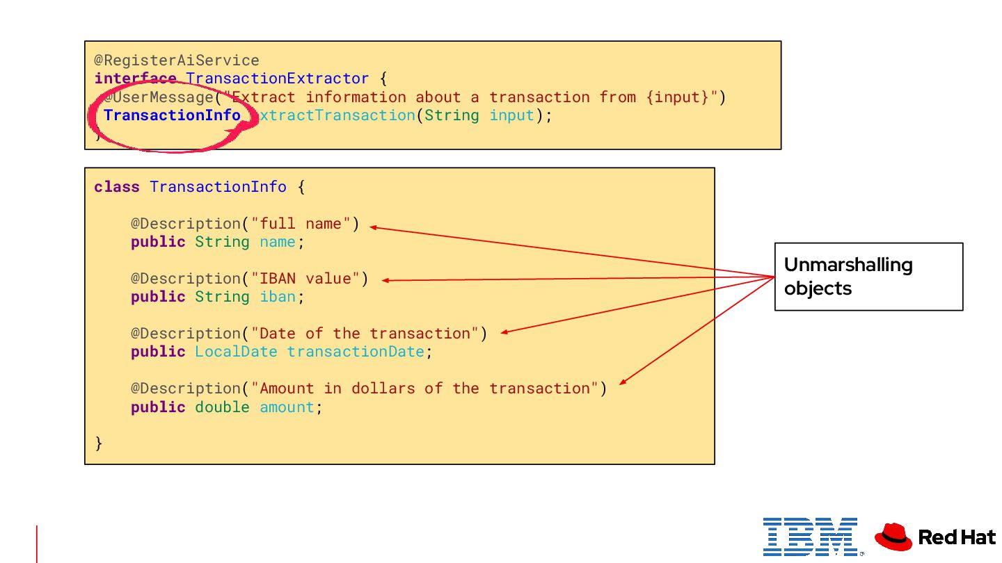 public String iban; @Description("Date of the transaction") public LocalDate transactionDate; @Description("Amount in dollars of the transaction") public double amount; } @RegisterAiService interface TransactionExtractor { @UserMessage("Extract information about a transaction from {input}") TransactionInfo extractTransaction(String input); } Unmarshalling objects