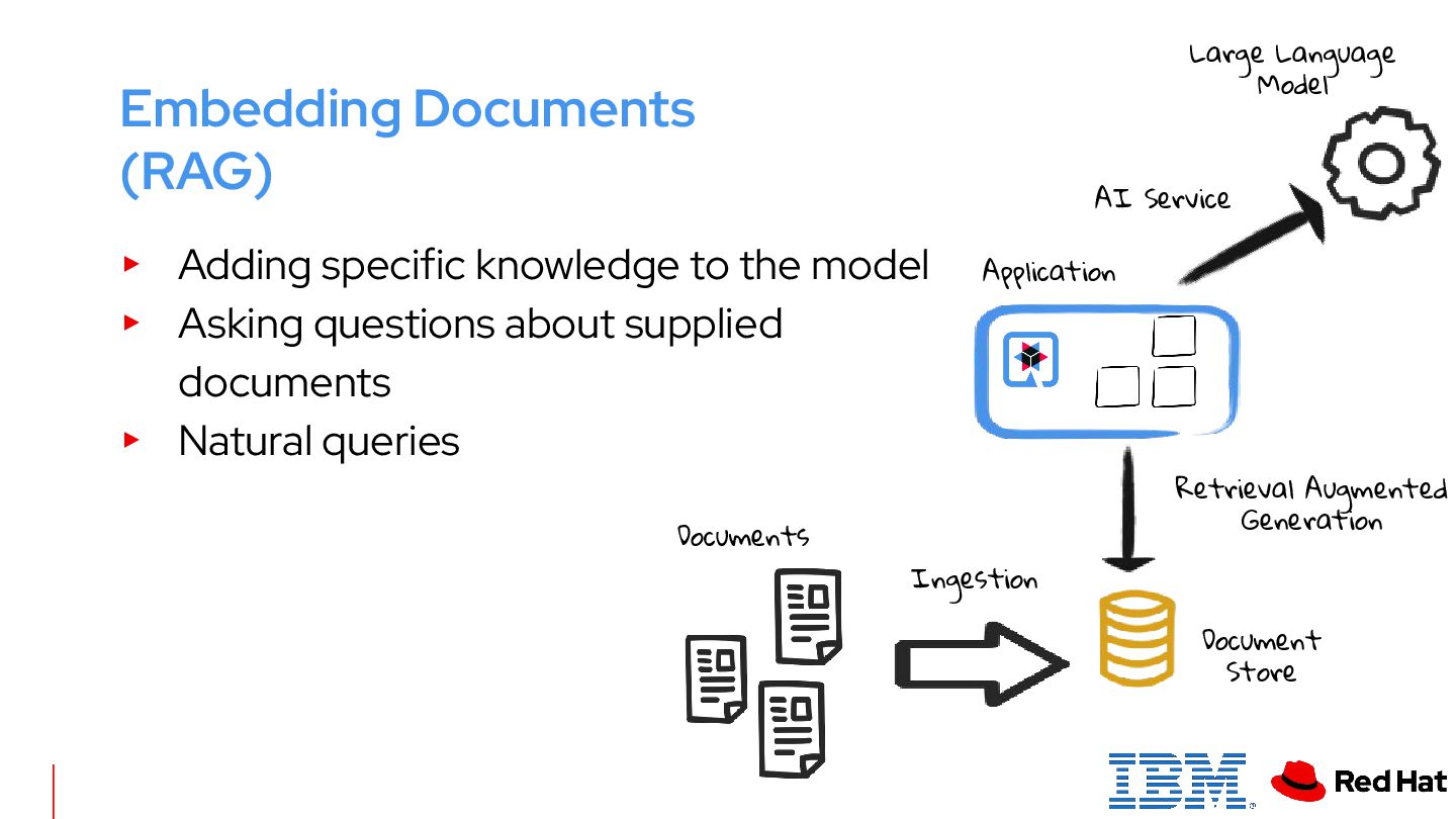 ▸ Asking questions about supplied documents ▸ Natural queries Application AI Service Large Language Model Retrieval Augmented Generation Document Store Ingestion Documents