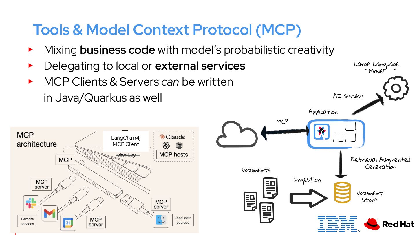 with model’s probabilistic creativity ▸ Delegating to local or external services ▸ MCP Clients & Servers can be written in Java/Quarkus as well LangChain4j MCP Client Application AI Service Large Language Model Retrieval Augmented Generation Document Store Ingestion Documents MCP