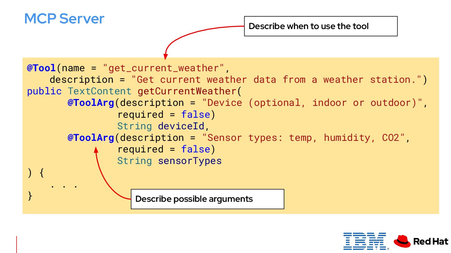 a weather station.") public TextContent getCurrentWeather( @ToolArg(description = "Device (optional, indoor or outdoor)", required = false) String deviceId, @ToolArg(description = "Sensor types: temp, humidity, CO2", required = false) String sensorTypes ) { . . . } Describe when to use the tool Describe possible arguments MCP Server