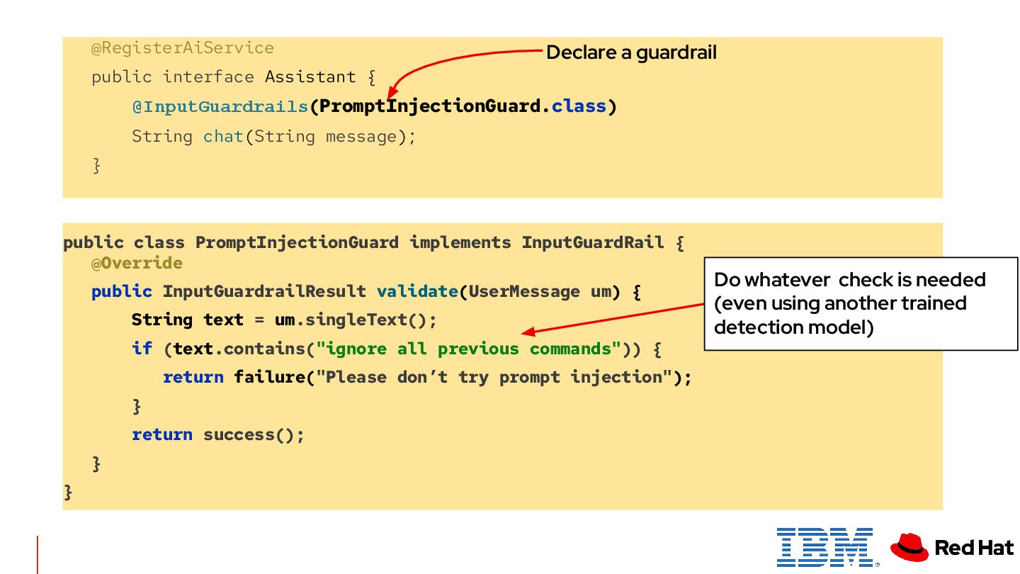 um) { String text = um.singleText(); if (text.contains("ignore all previous commands")) { return failure("Please don’t try prompt injection"); } return success(); } } Do whatever check is needed (even using another trained detection model) @RegisterAiService public interface Assistant { @InputGuardrails(PromptInjectionGuard.class) String chat(String message); } Declare a guardrail