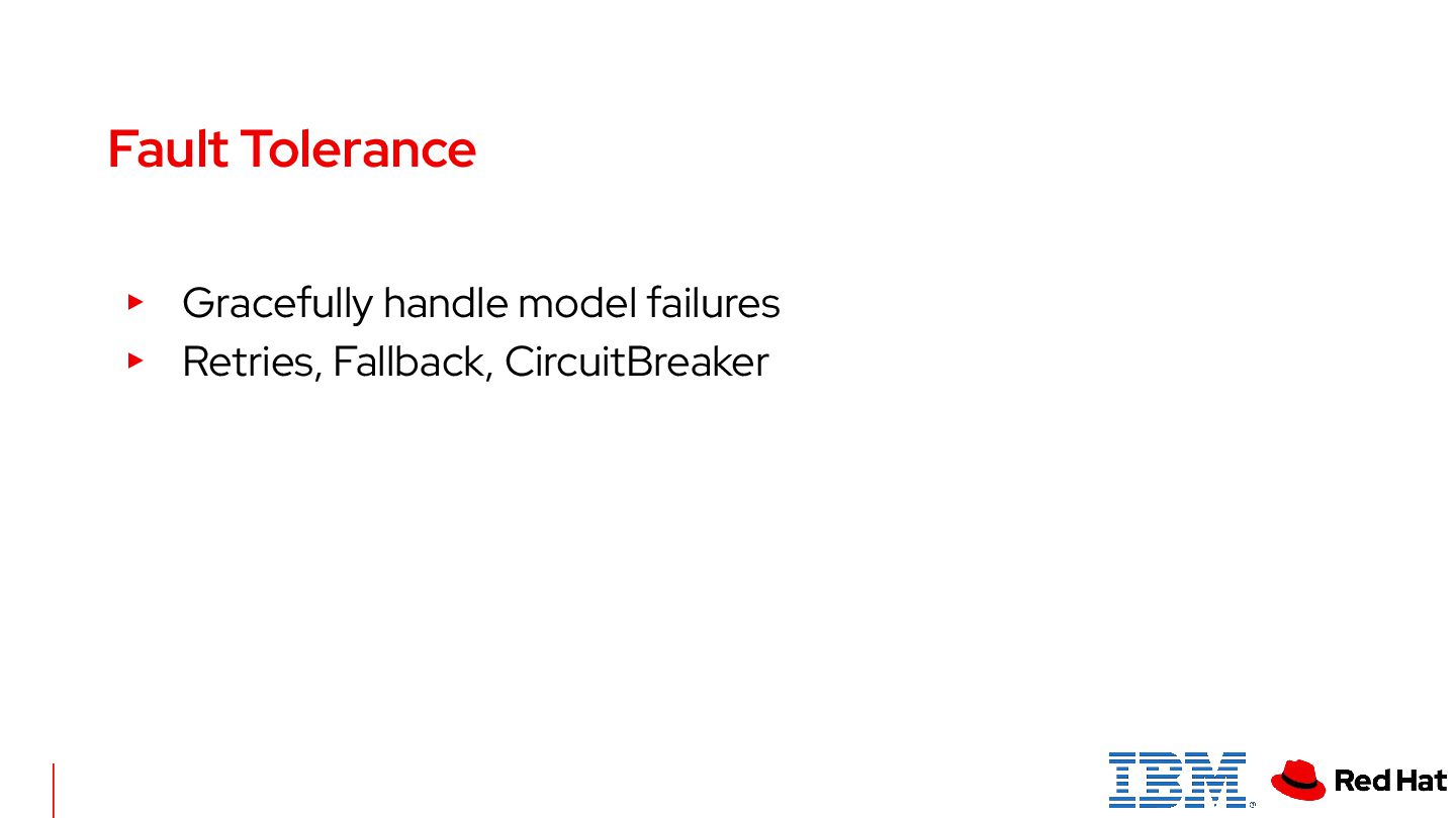@UserMessage("Create a class about {topic}") @Fallback(fallbackMethod = "fallback") @Retry(maxRetries = 3, delay = 2000) public String chat(String topic); default String fallback(String topic){ return "I'm sorry, I wasn't able create a class about topic: " + topic; } } Handle Failure $ quarkus ext add smallrye-fault-tolerance Add MicroProfile Fault Tolerance dependency Retry up to 3 times