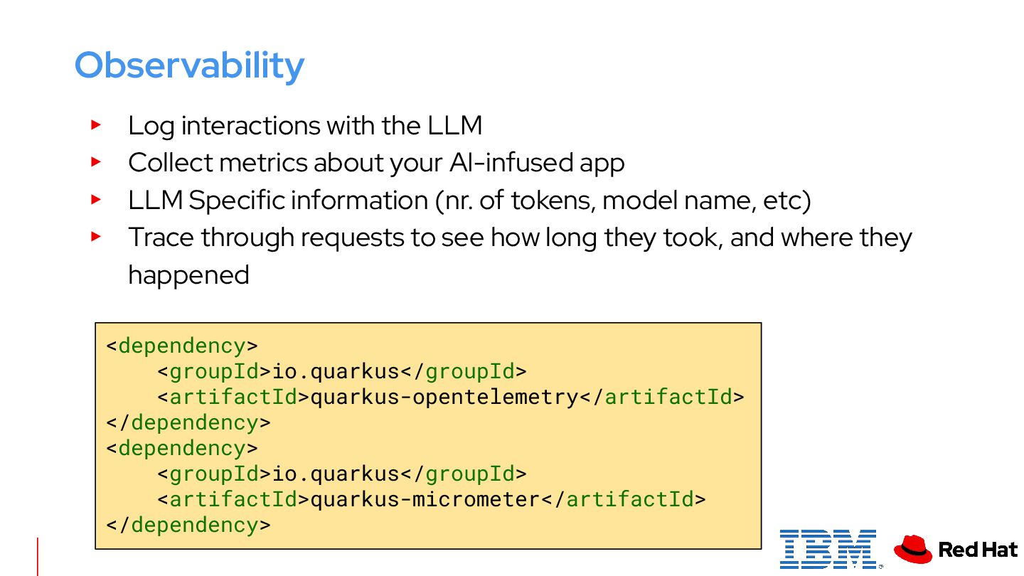 about your AI-infused app ▸ LLM Specific information (nr. of tokens, model name, etc) ▸ Trace through requests to see how long they took, and where they happened <dependency> <groupId>io.quarkus</groupId> <artifactId>quarkus-opentelemetry</artifactId> </dependency> <dependency> <groupId>io.quarkus</groupId> <artifactId>quarkus-micrometer</artifactId> </dependency>