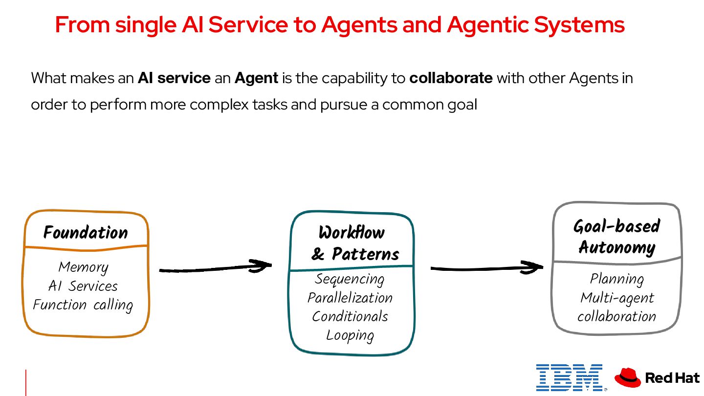 makes an AI service an Agent is the capability to collaborate with other Agents in order to perform more complex tasks and pursue a common goal Foundation Memory AI Services Function calling Workflow & Patterns Sequencing Parallelization Conditionals Looping Goal-based Autonomy Planning Multi-agent collaboration