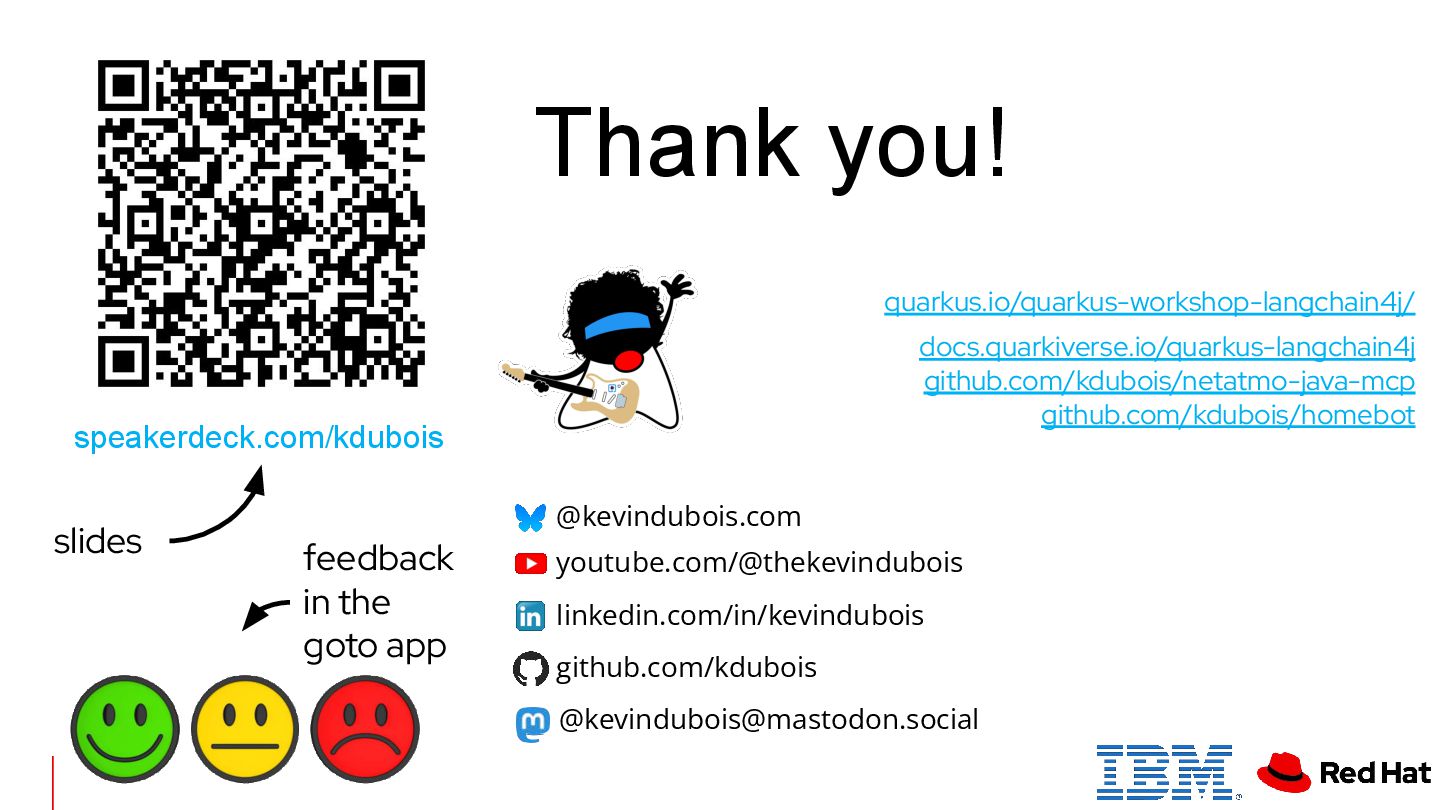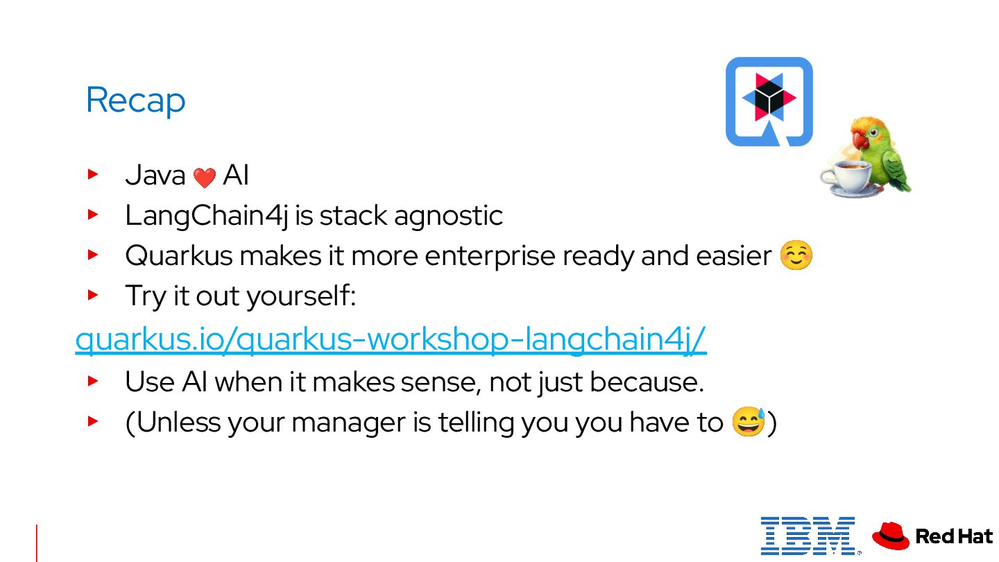 Quarkus makes it more enterprise ready and easier ☺ ▸ Try it out yourself: quarkus.io/quarkus-workshop-langchain4j/ ▸ Use AI when it makes sense, not just because. ▸ (Unless your manager is telling you you have to 😅) Recap